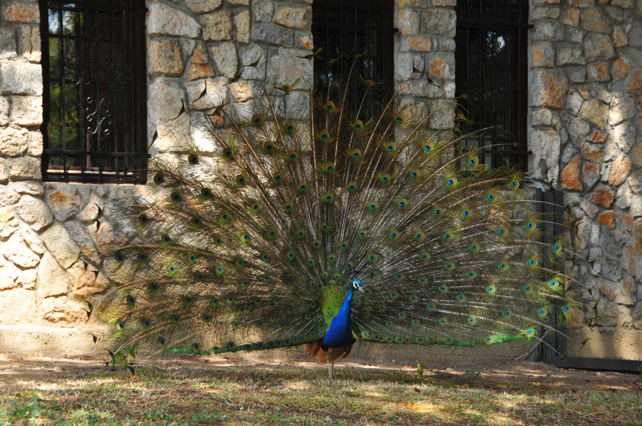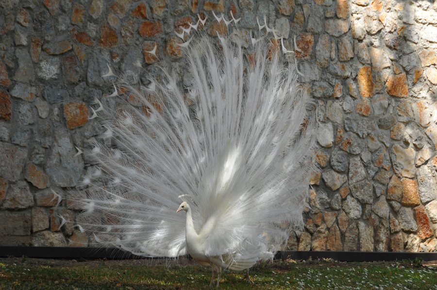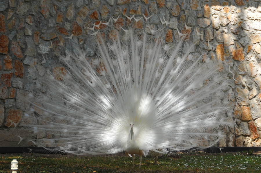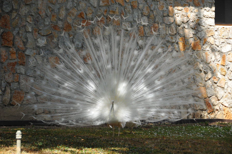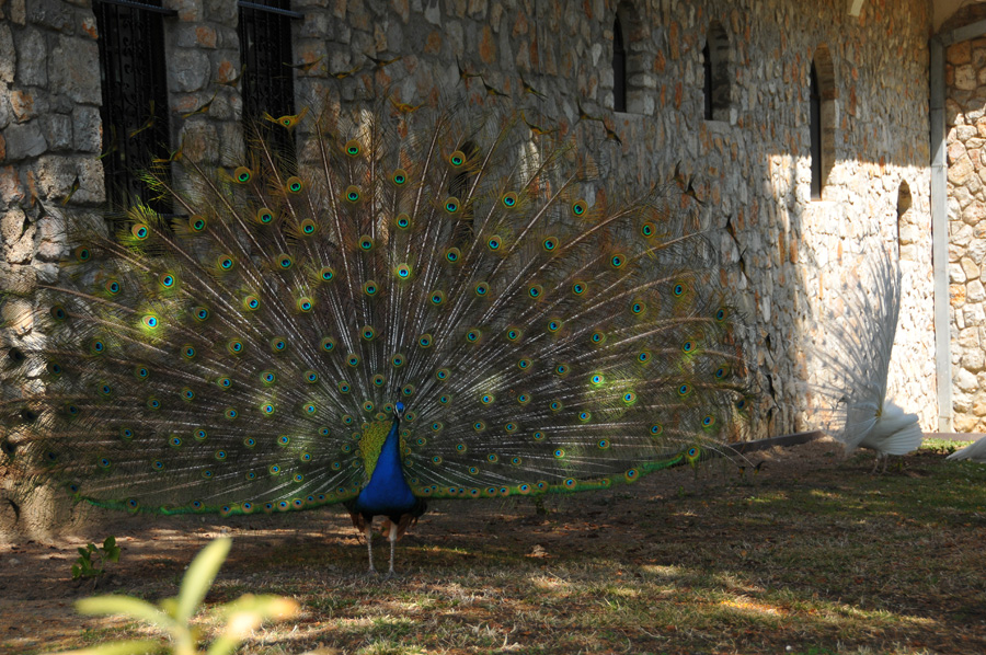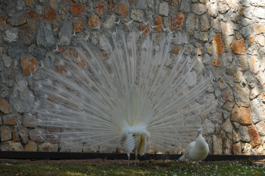 Wir hatten das Glück oder besser die Ausdauer dieses Prozedere bei den Pfauen der Klosteranlage Sveti Naum ausgiebig beobachten zu können, insbesondere auch deshalb, weil es hier auch Weiße Pfauen gibt, die wir zuvor noch nicht gesehen hatten. Der weiße Pfau wird oft für einen Albino gehalten, was allerdings nicht richtig ist, denn es handelt sich hierbei nicht um Albinismus, sondern um Leuzismus, weshalb seine Iris dunkel und nicht rot ist. Unsere Exemplare waren wohl so begeistert bei der Sache, das wir ausgiebig fotografieren konnten.