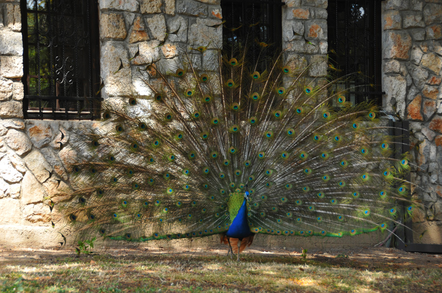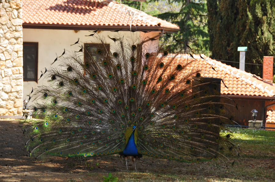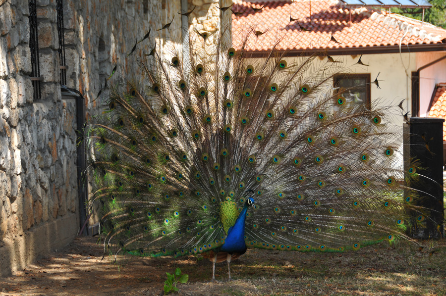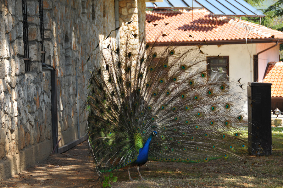 In Parkanlagen, besonderen Gärten oder auch an Gebäuden, so auch an der Klosteranlage von Sveti Naum, trifft der Besucher auf den Blauen Pfau, aufgrund ihres auffälligen Aussehens gelten vor allem die Männchen als die ältesten Ziervögel dieser Welt.