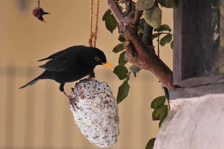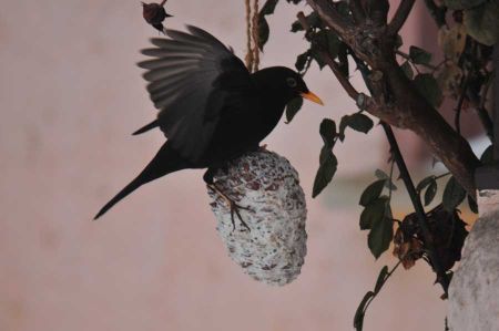 Eine Amsel versucht sich am Meisen Knödel
