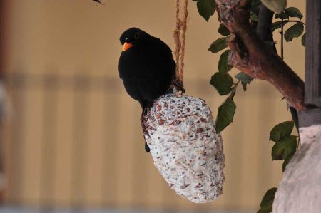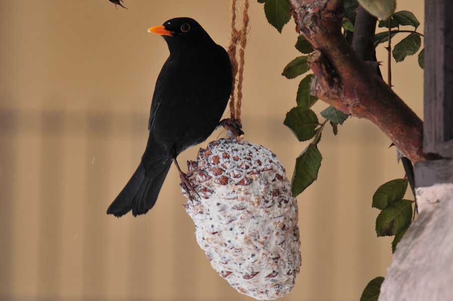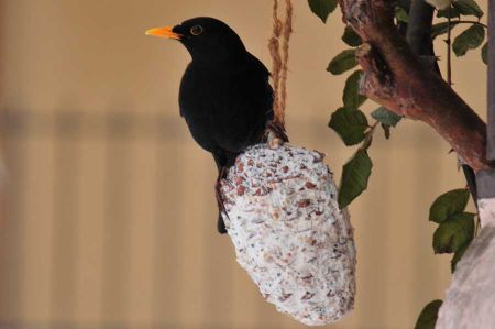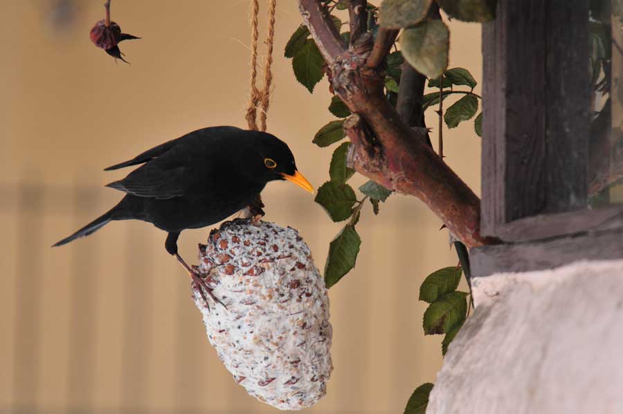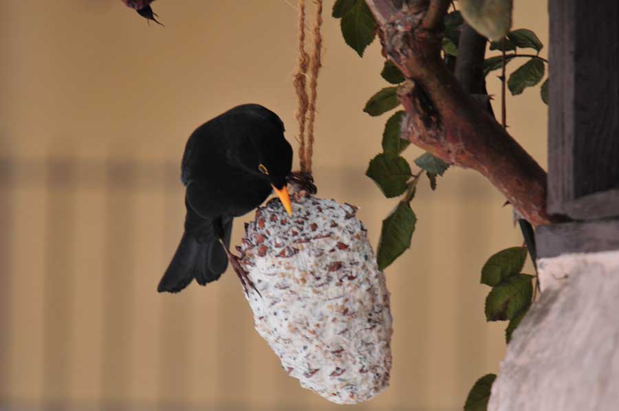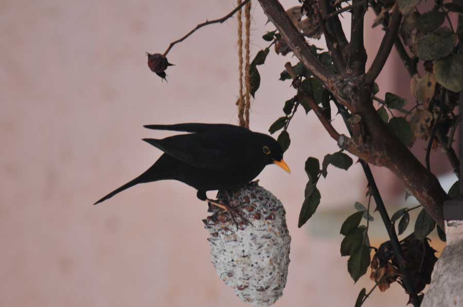 Wir hatten einige Meisen Ringe und Knödel aufgehängt, um den Tieren bei der Schneehöhe zumindest mit etwas Nahrung über die Tage zu helfen. Zunächst keine Chance für unsere Amsel, denn bei Nahrungsmangel nutzen Amseln im Siedlungsgebiet das Angebot der Winterfütterung, auch werden Sämereien in größeren Mengen aufgenommen, aber diese werden wie die Samen aufgenommener Früchte kaum verdaut. Amseln suchen dann auch in Abfällen nach Nahrung.