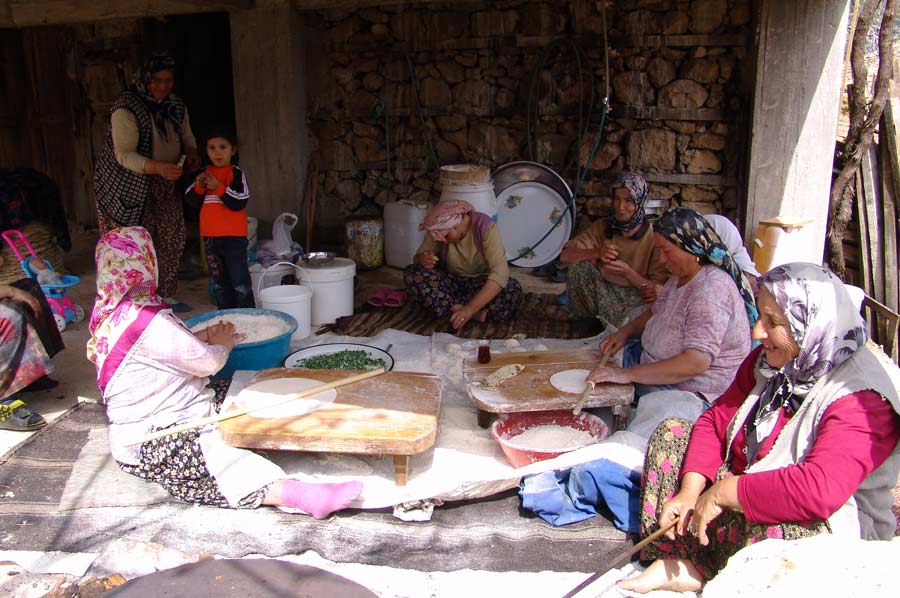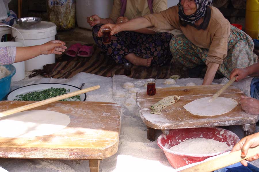 Entsprechend parkten wir das Fahrzeug, gingen eine Schritte durch das Dorf, wobei wir auch auf eine Gruppe von Frauen trafen, die sich mit der Herstellung von Fladenbrot in großen Mengen beschäftigten. Natürlich war unser Interesse geweckt, zumal neben dem Fladenbrot auch noch Käse und Kräuter bereit standen, um frisches Brot damit zu belegen. Unmittelbar war die Einladung der Dörflerinnen erfolgt, sich ihrem Kreis anzuschließen. Das halbe Dorf hatte sich versammelt und wir erfuhren im Gespräch, das es in Sirtköy üblich ist, sich zur Erstellung der Wochenration Fladenbrot zu versammeln und gemeinsam zu backen.