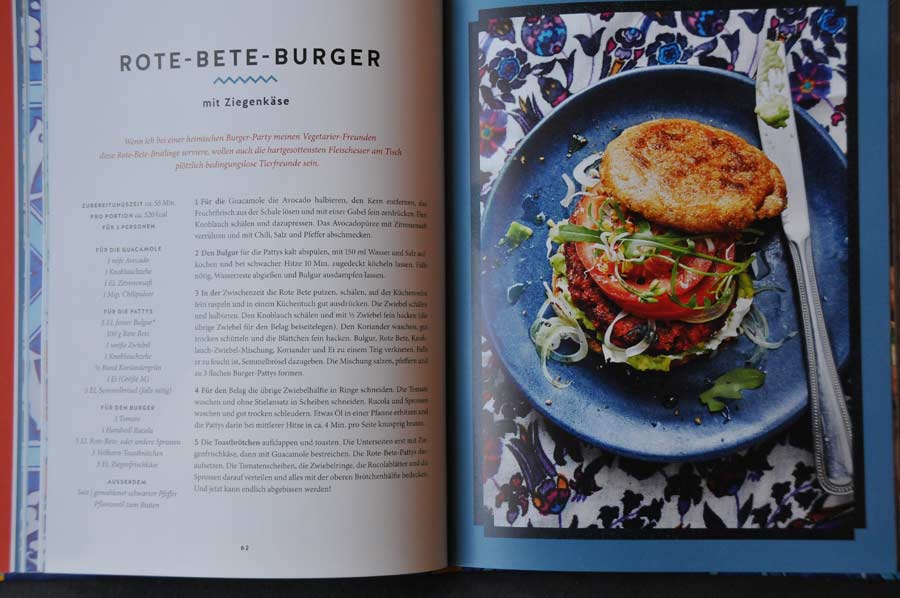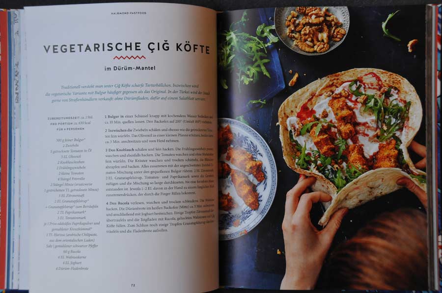 - Halbmond-Fastfood – Streetfood Classics auf Türkisch: z. B. Wrap auf Türkisch (mit Kichererbsen und Avocado), Pide to Love, Lammburger de luxe, Rote-Bete-Burger, Bulgur-Pfannküchlein, Vegetarische Köfte, Curry-Falafel, Lamb & Chips