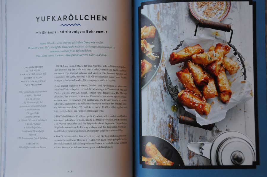- Istanbul daheim in Deutschland – wie die Spreewaldgurke in die Köfte fand: z. B. Bohnen-Joghurt-Suppe, Türkische Nudelsuppe, Minzige Linsensuppe, Pilav mit Kürbis-Kastanien-Ragout, Yufkaröllchen mit Shrimps und zitronigem Bohnenmus, Vegetarische Manti, Spinat-Börek