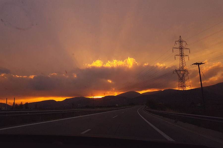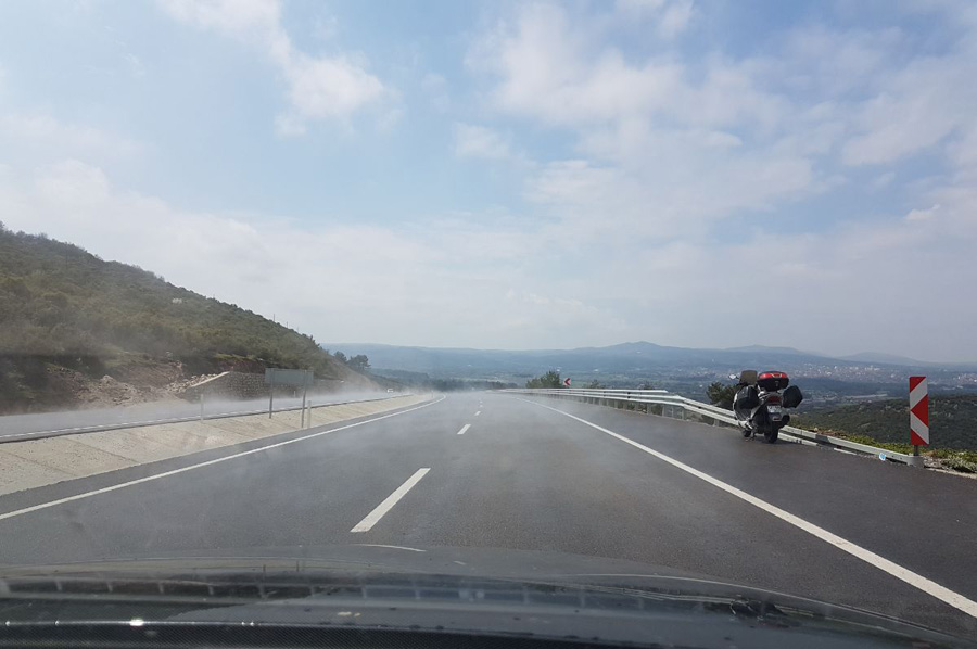 Nach dem Überqueren der Grenze Türkei / Griechenland waren wir bei Alexandroupolis erneut in einen heftigen, aber auch sehr kurzen Regenschauer geraten, so dass das Wasser unter teilweise heftiger Nebelbildung auf dem warmen Asphalt schnell wieder verdampfte.