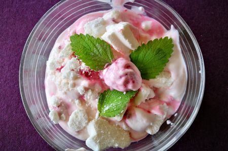 Die Sahne wird fest geschlagen und dann im Yoghurt unter gerührt. Auch ein Teil der Früchte, der durchaus auch püriert sein kann, wird der Mischung hinzugefügt und vorsichtig untergerührt. Gerade die fruchtig-roten Streifen geben dem Dessert ein tolles Aussehen. Jetzt werden die ganzen Früchte hinzugefügt und unter gehoben und in die Kühlung zu stellen.