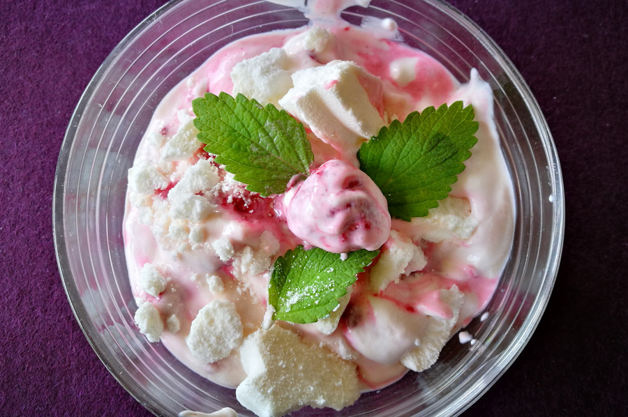 Man besorge sich möglichst frische Früchte, in unserem Fall waren es Himbeeren, die zur Frischeerhaltung und auch aufgrund der Kühlung in der Sahne und im Yoghurt durchaus gefroren sein dürfen. Gerade bei heißen Tagestemperaturen sind es die kalten Früchte, die zum eisartigen Charakter der Nachspeise beitragen. Man benötigt weiterhin Sahne, Yoghurt, wer möchte etwas Vanillinpulver und die besondere Zugabe von Heidi: Original Baiser Meringe (natürlich funktioniert es auch mit anderen Baiser´n oder halt selbst Gemachten: Baiser ist eine süße Masse aus Eischnee und Zucker, die im Ofen getrocknet wird).