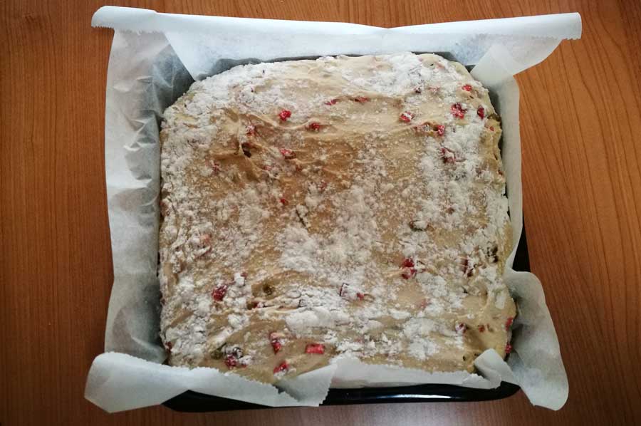 Danach den Teig nochmals kurz durchkneten und anschließend in eine vorhandene Backform einfüllen. Wir haben in unserem Fall, die Auffangform des im Fendt-Caravan vorhandenen Grills verwendet, die wir mit Backpapier belegt hatten. Danach für weitere 20 Minuten gehen lassen. Das Brot im vor geheizten Ofen (E-Herd: 200 °C/Umluft: 175 °C/Gas: Stufe 3) 40 - 45 Minuten backen.