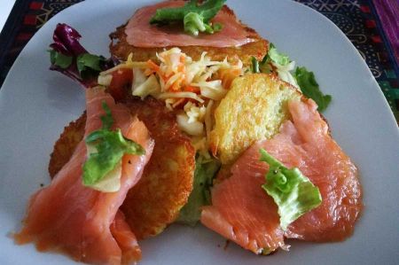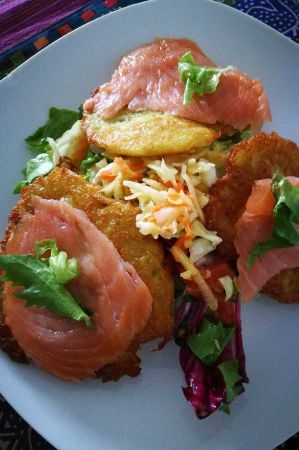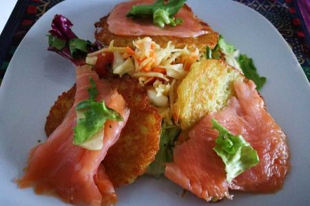Rauchlachs auf Kartoffelpuffer - mit buntem Salat angemacht