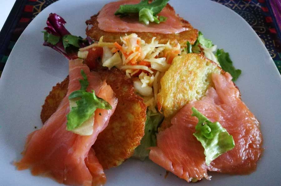 Ein wenig vom bunten Salat auf den Teller, die Reibekuchen darüber platziert, dann den Räucherlachs on top. Schnell und einfach zubereitet, ein leckeres Gericht. Wer mag, nimmt etwas Sahne-Meerrettich als I-Tüpfelchen und zur geschmacklichen Abrundung.