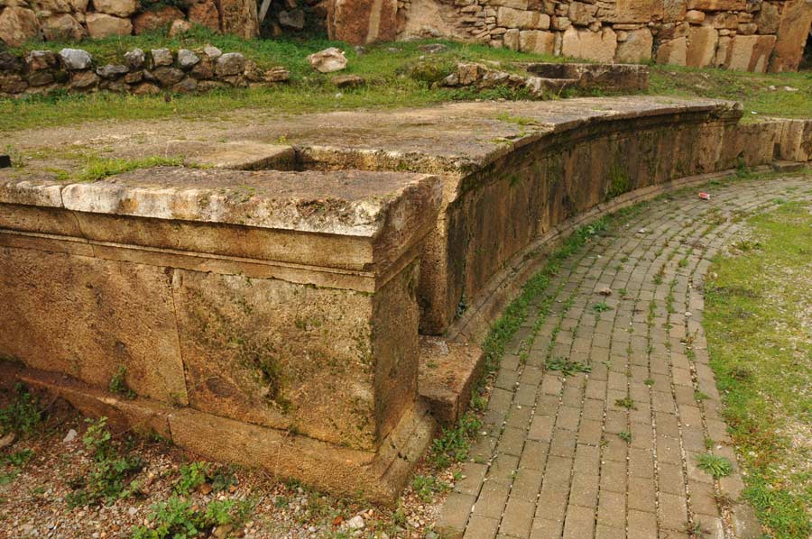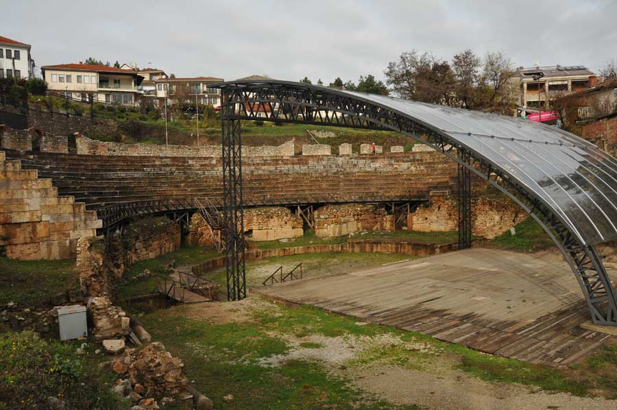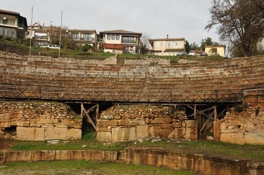 Der florierende Handel der Römer sorgte für den raschen Ausbau der Stadt: es entstanden neben dem Theater eine Agora, ein Gymnasium, ein Buleuterion, eine Basilika und zahlreiche Tempel, die alle jedoch nur teilweise erhalten bzw. noch nicht ausgegraben worden sind. Das Theater, das den ersten Anfahrtspunkt unserer heutigen Erkundung bilden sollte, ist wohl das bekannteste Überbleibsel der antiken Stadt. Die Anfahrt zum Theater deutete schon auf das Alter der Stadtanlage hin, denn die engen und teilweise steilen Gassen waren für Straßenverkehr im heutigen Sinn nie geplant worden. Das Theater wurde um das Jahr 200 v. Chr. erbaut, wobei es gleichzeitig das einzig hellenistische Theater in ganz Mazedonien ist. Während der hellenistischen Zeit wurden hier Komödien, Tragödien und Dramen aufgeführt. Mit den Römern kamen Gladiator- und Tierkämpfe hinzu. In den drei oberen Sitzreihen sind einige Inschriften von Personennamen angebracht, die wahrscheinlich als Platzreservation während Aufführungen dienten. Insgesamt sind zwölf Sitzreihen der Zuschauertribüne (lat. cavea) erhalten geblieben.