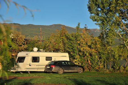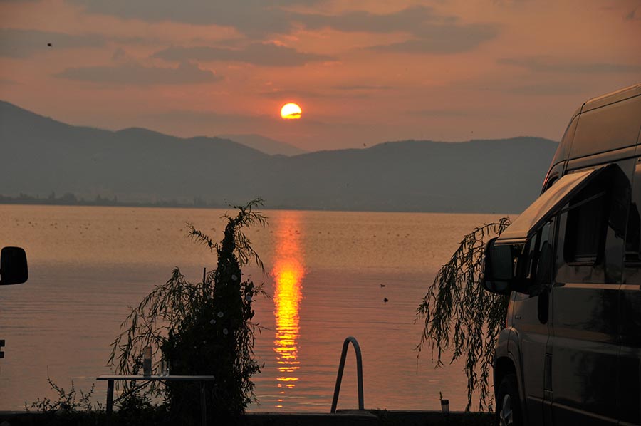 Wir überquerten die griechisch-mazedonische Grenze in Richtung Bitola (römisch Herakleia Lynkestis, das Ruinenfeld liegt direkt am Rande der Stadt), von wo aus es immer entlang des Baba Gebirgszugs weiter nach Ohrid (römisch Lychnidos) und von dort nach Struga (römisch wahrscheinlich Enhallon) geht. Die Strecke war uns von unseren Erkundungen des letzten Jahres noch gut bekannt, führt sie doch in weiten Teilen immer parallel der alten Route der römischen Via Egnatia. Schon wenig später waren wir am Campingplatz Rino angekommen, wo uns Familie Sadiku, gastfreundlich wie gewohnt, schon erwartete. Neben dem hier obligatorischen Begrüßungsmokka, den die Campinggäste übrigens jeden Tag kostenlos erhalten, hatte Frau Sadiku für uns eine besondere Überraschung vorbereitet: eine traditionell mazedonische Pizza, die aus Maismehl hergestellt wird. Vielleicht verrät sie uns später die Rezeptur!