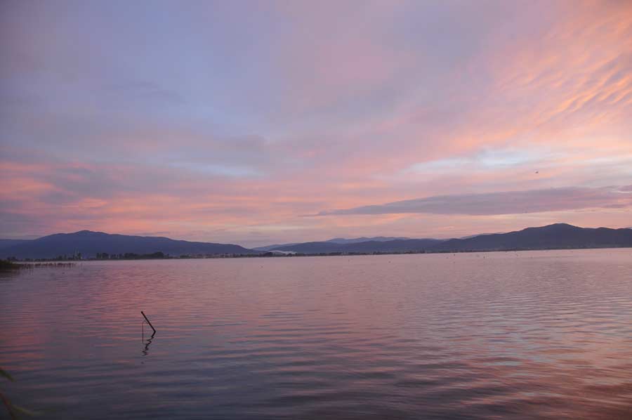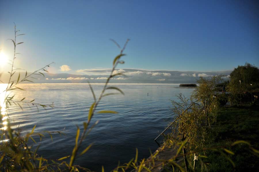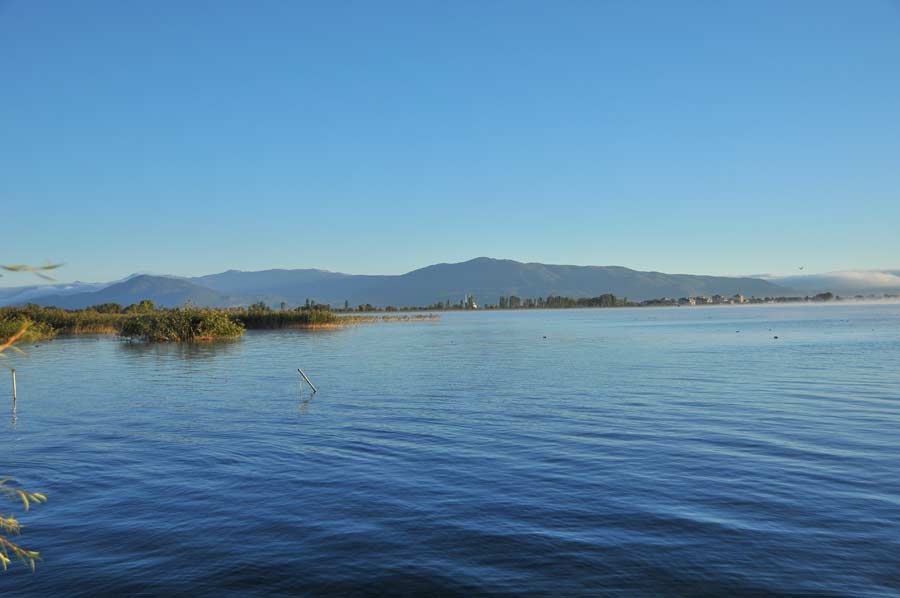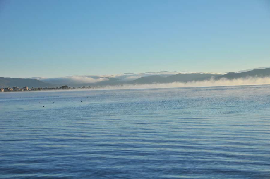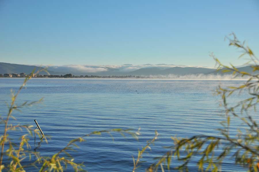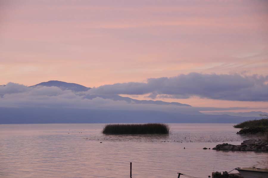 Der nächste Morgen war dann einmal mehr nur mit herrlich zu bezeichnen: keine Wolke am hohen Himmel des auf 600 Meter Höhe befindlichen Sees. Nur hinter den Bergen, die den See einrahmen gab es Wolken. Der Dunst des noch warmen Seewassers stieg auf, bildete kleine Wolken, die gen Albanien zogen, dann aber mit stärker werdender Sonneneinstrahlung schnell wieder verschwanden. Es schien ein herrlicher Tag zu werden, den wir für eine weitere Fahrradtour in Richtung Struga nutzen wollten. Hier einige Impressionen des heutigen Morgens.