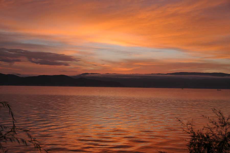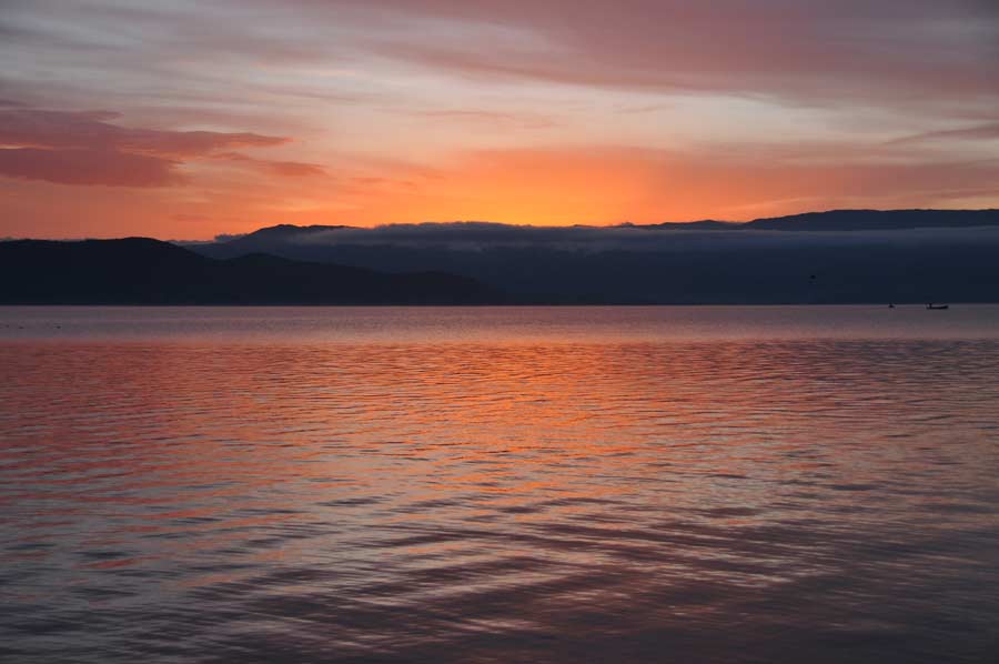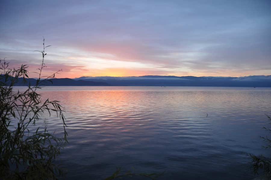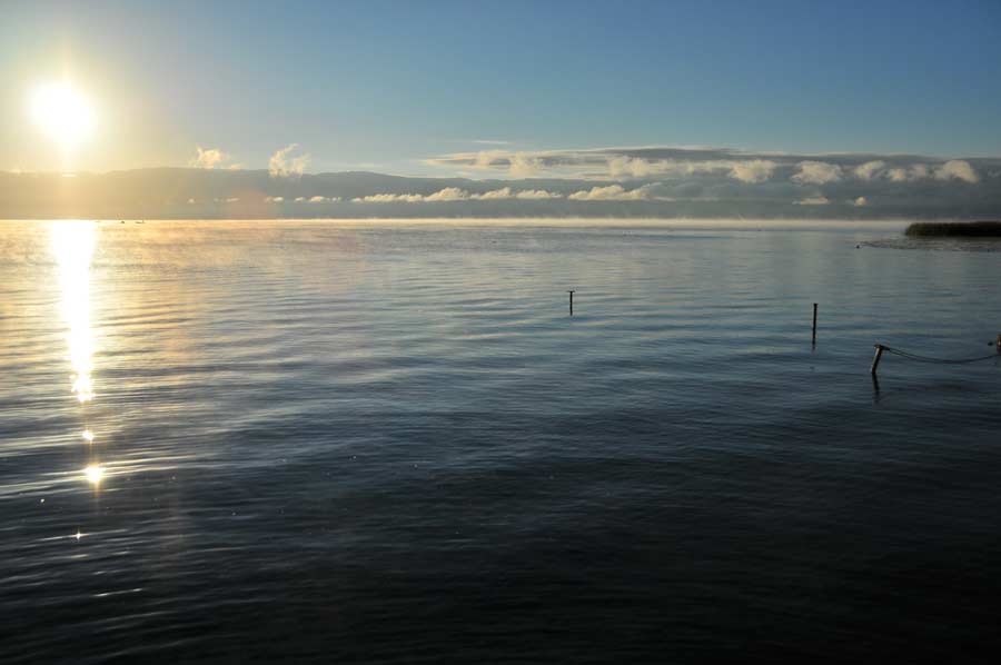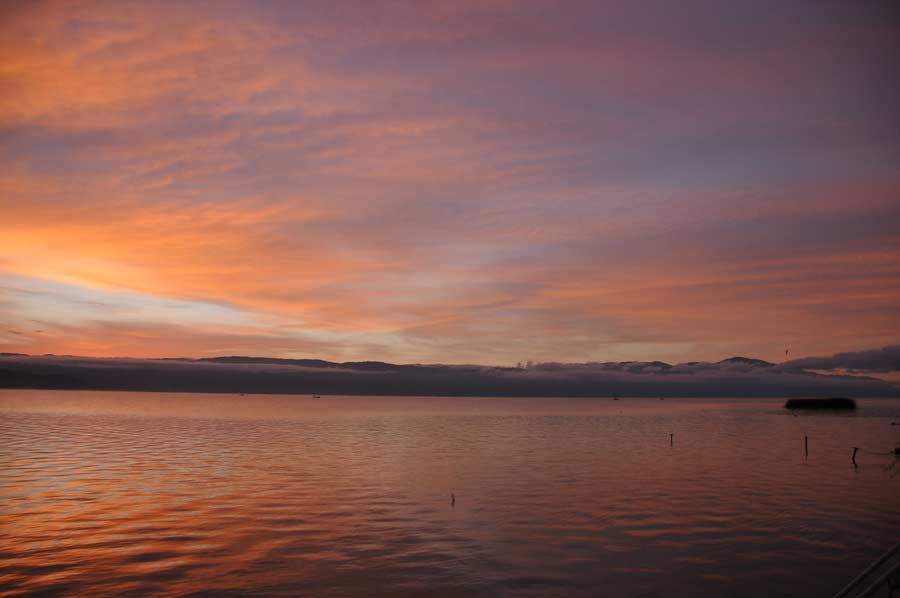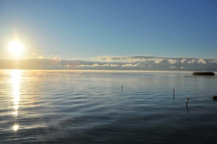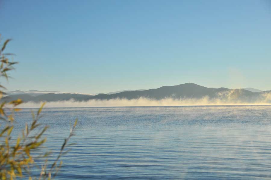 Der nächste Morgen war dann einmal mehr nur mit herrlich zu bezeichnen: keine Wolke am hohen Himmel des auf 600 Meter Höhe befindlichen Sees. Nur hinter den Bergen, die den See einrahmen gab es Wolken. Der Dunst des noch warmen Seewassers stieg auf, bildete kleine Wolken, die gen Albanien zogen, dann aber mit stärker werdender Sonneneinstrahlung schnell wieder verschwanden. Es schien ein herrlicher Tag zu werden, den wir für eine weitere Fahrradtour in Richtung Struga nutzen wollten. Hier einige Impressionen des heutigen Morgens.