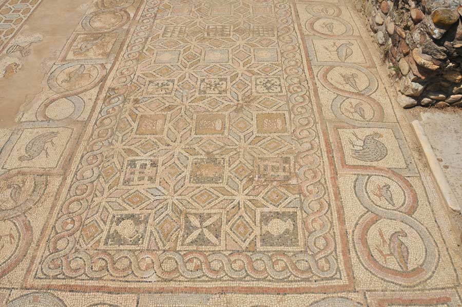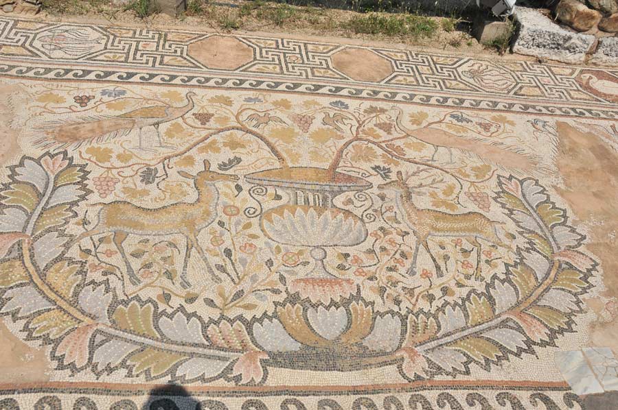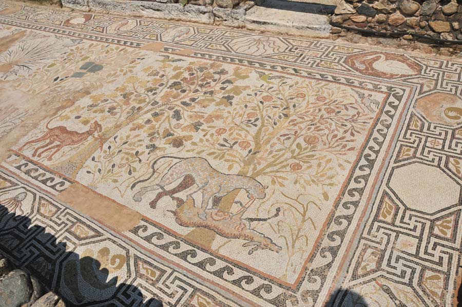 In den strengen Wintermonaten werden alle Mosaikflächen mit Kies beschüttet, um Witterungseinflüsse zu vermeiden. Überwiegend religiöse Motive, die auch aus anderen Regionen des frühen Christentums bekannt sind, bilden die Umfassung für Jagd- und Tiermotive von unglaublicher Pracht und Fülle.