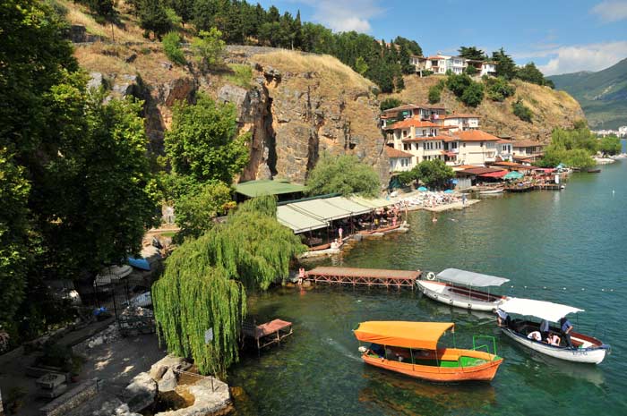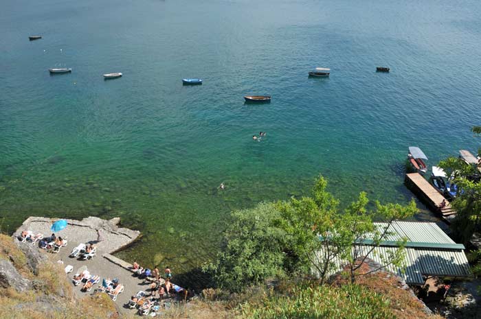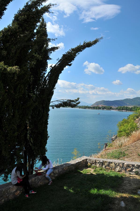 Natürlich ging es zunächst am Hafen entlang, dann folgten wir der Küstenlinie zwischen den Badegästen hindurch, die zahlreich das Ufer säumten. Überwiegend aus den Ländern des ehemaligen Jugoslawien stammend, ist der Ohridsee vielen Touristen auf dem Balkan durchaus bekannt. Das klare und saubere Wasser des Ohridsees trägt natürlich stark zum anwachsenden Tourismus bei, was leider noch nicht überall angekommen ist. Aber vielleicht ist auch das gut so, denn damit bleibt der Ohridsee hoffentlich in seiner Natürlichkeit noch lange erhalten. Wenig später nutzten wir eines der vielen Restaurant für einen Frappe, der sich auch hier in Mazedonien große Beliebtheit erfreut.