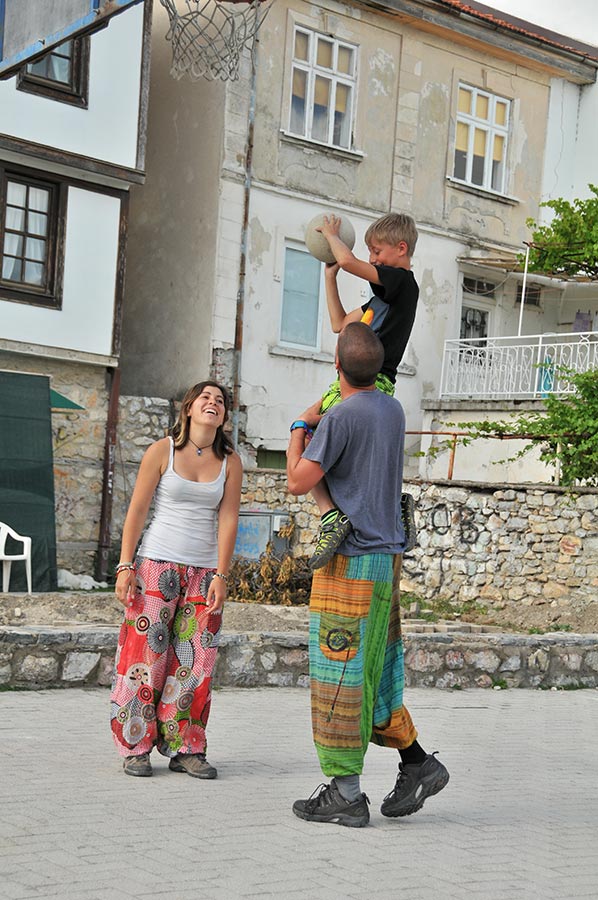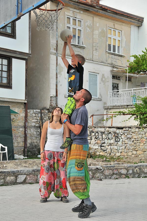 Beide mit einem jungen Bewohner Ohrids in ein Basketballspiel vertieft