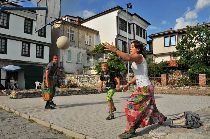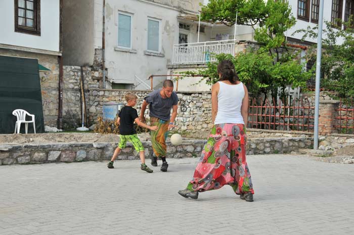 Über die Burg ging es dann zurück in die Altstadt, wo Luis noch einige Souvenirs für Freunde und Bekannte einkaufen wollte. Wenig später waren Beide mit einem jungen Bewohner Ohrids in ein Basketballspiel vertieft, so das wir noch ein wenig das Seewasser genießen konnten. Zunächst wollten Marta und Luis von Ohrid aus ihre Reise fortsetzen, was sich aufgrund der vorgerückten Stunde dann aber doch schnell erledigte.