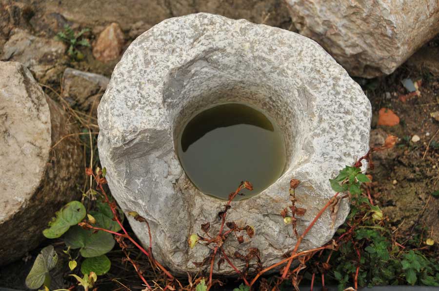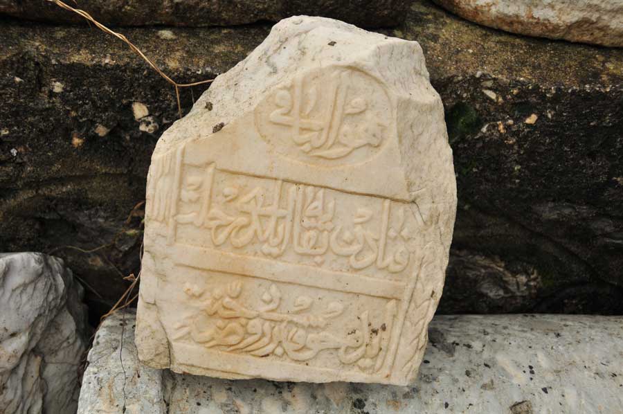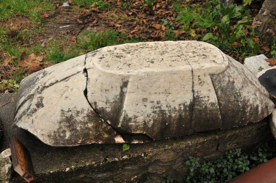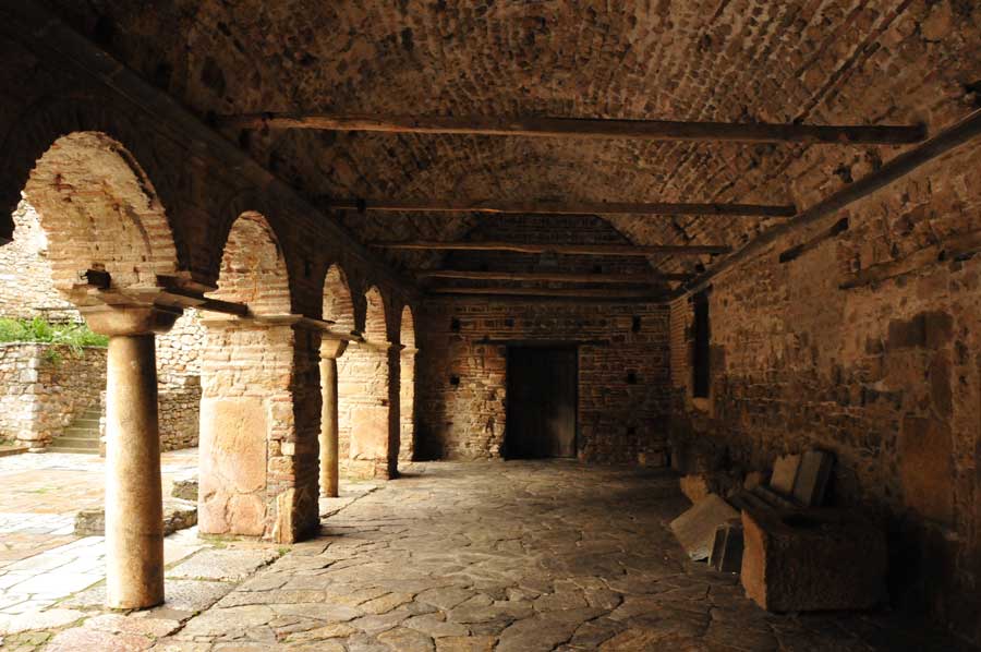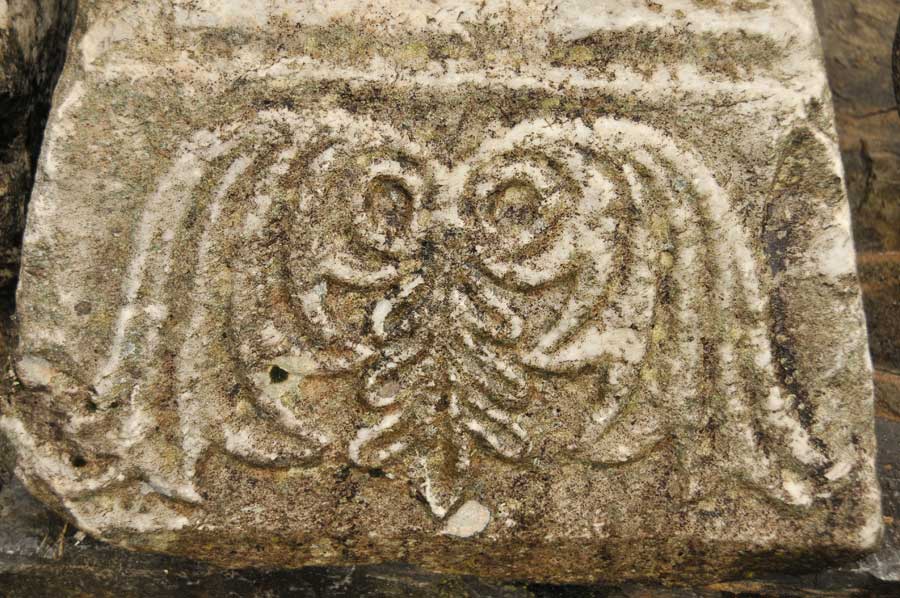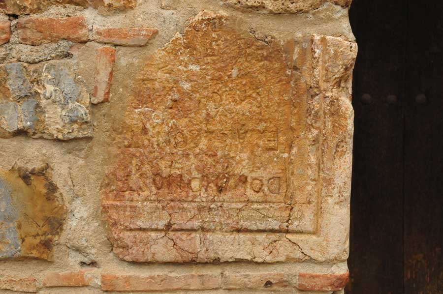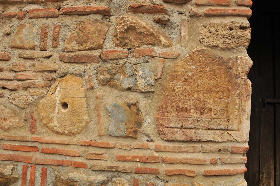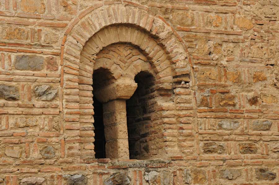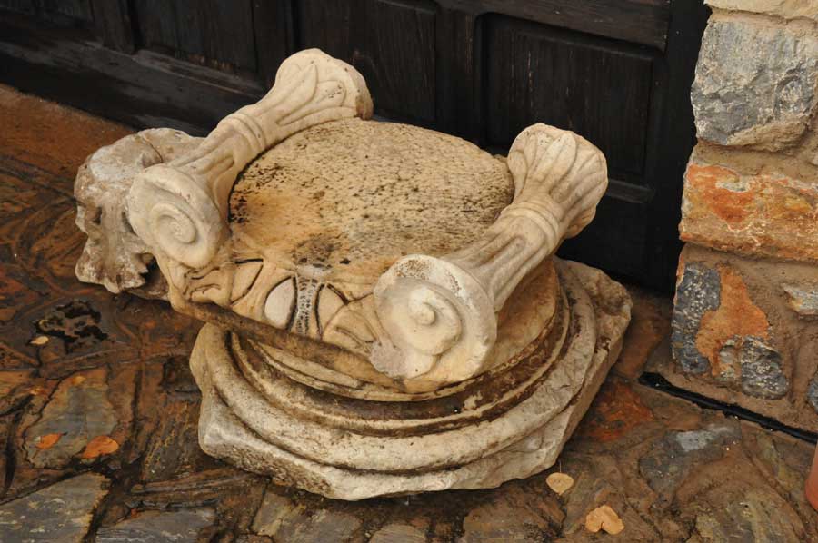 Überall am Gebäude lassen sich Reste vorher vorhandener Gebäudeteile erkennen, die weit vorher schon im "Einsatz" waren. Allein die Betrachtung der wieder verwendeten Säulenteil lassen Rückschlüsse bis in die hellenistische Zeit zu (siehe auch Theaterbau).