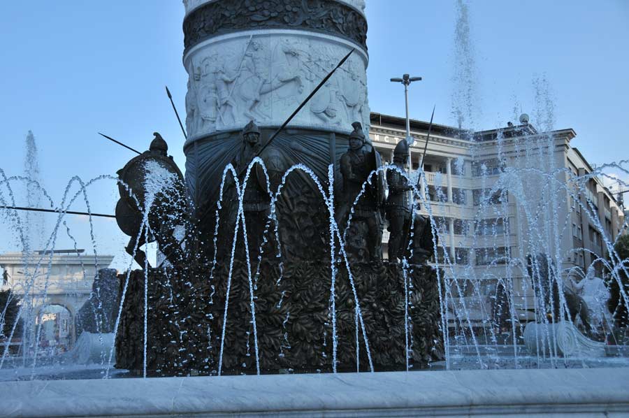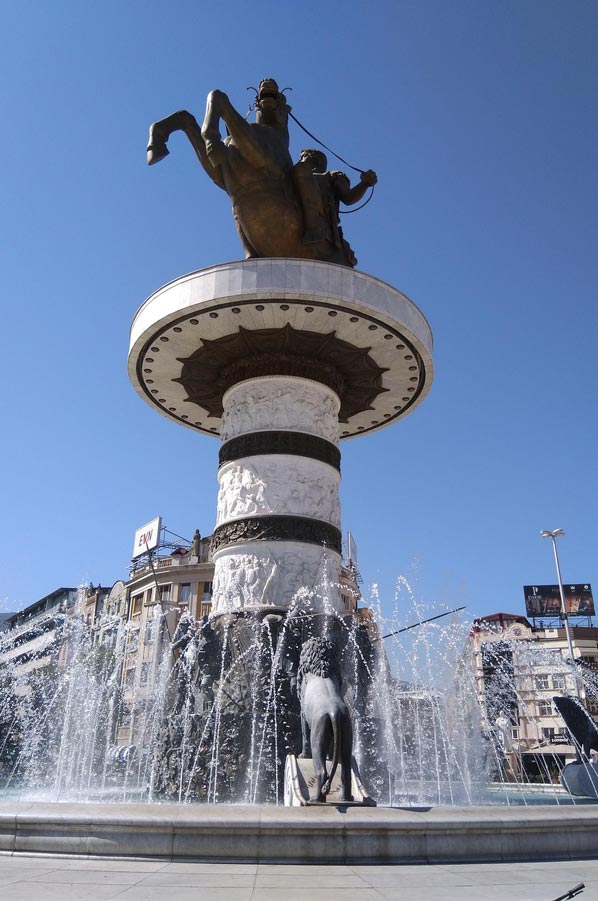 Auch die Gebäude, neo-klassizistisch, vielleicht auch ein Gemenge verschiedener Epochen vermittelte nicht den Eindruck wirklich sehenswerter Architektur, eher auch wieder im Stile Disneyland übertrieben monströs, hier wäre weniger mehr gewesen. Und alle paar Meter neue Skulpturen und Figuren, was sich auch auf der anderen Seite des Vardar nicht änderte. Im Zentrum dieses Arrangements gab es dann noch eine riesige Säule mit dem Standbild Alexander des Großen, die in weiteren Ornamentbildern verschiedene Schlachtensegmente nachzeichneten, das ganze gesäumt von Wasserspielen und mit Musik beschallt. Sicherlich begründet auf dem Gedanken, hier etwas ganz besonderes zu errichten, konnten wir den Berichterstattern in Ohrid wirklich nur noch Recht geben. Es fehlt im ganzen Land an Infrastruktur vor allem auch hinsichtlich der Müllentsorgung. Hier wären Investitionen dringend erforderlich, die sich nicht allein auf die Müllberge überall an den Straßenrändern auswirken sollte sondern vor allen Dingen in der Pädagogik, damit zumindest die nächste Generation sensibilisiert werden würde.