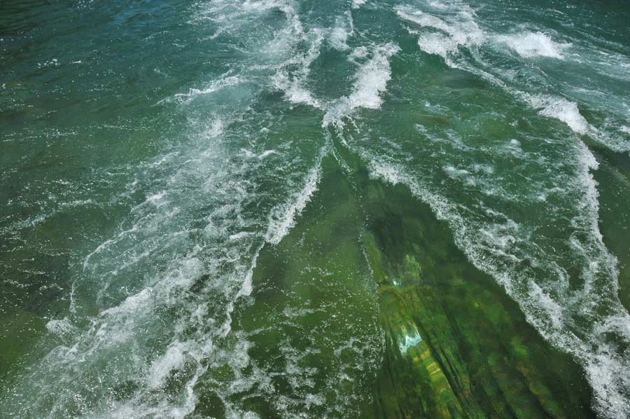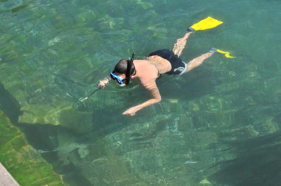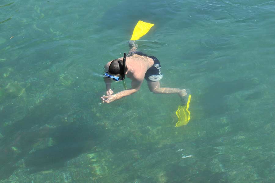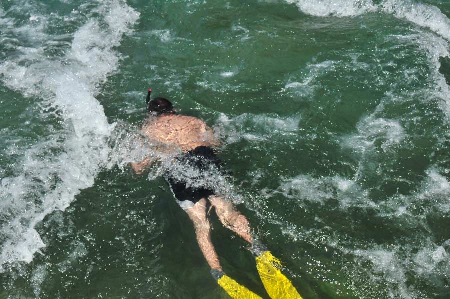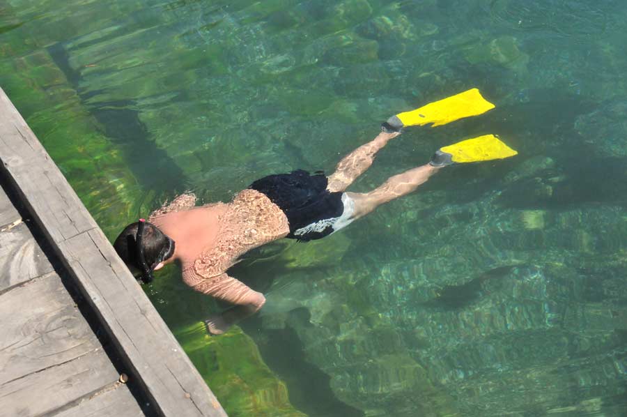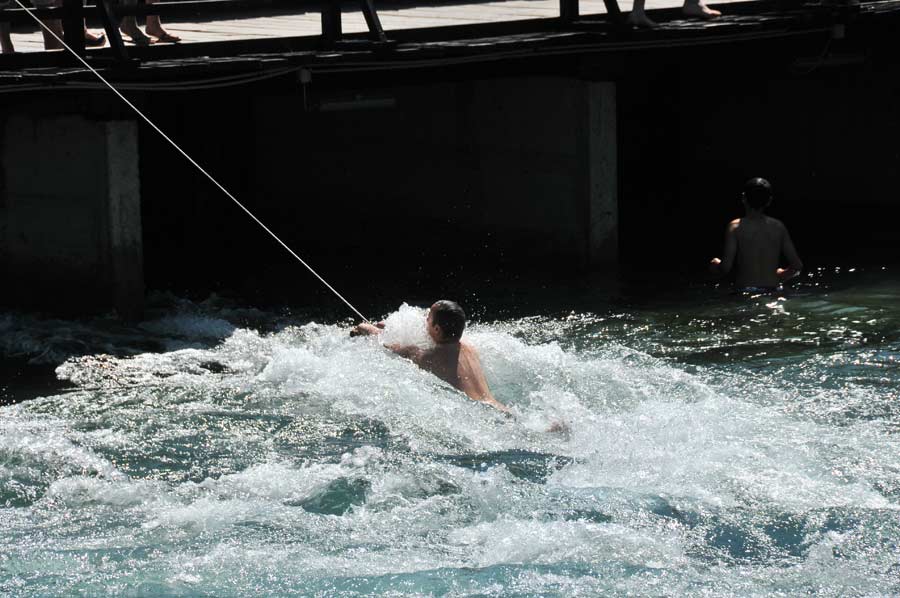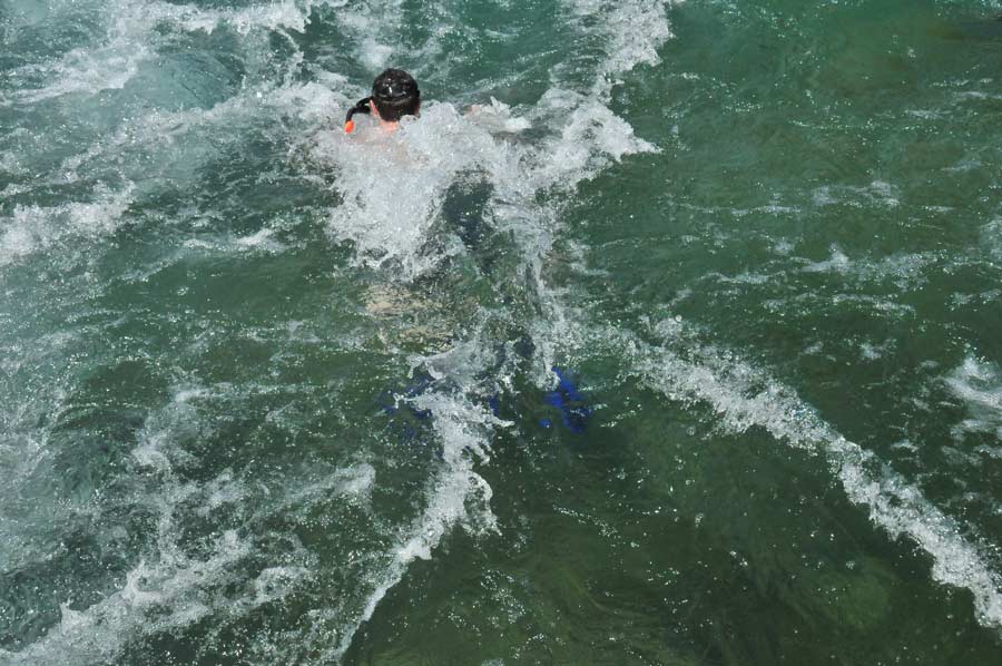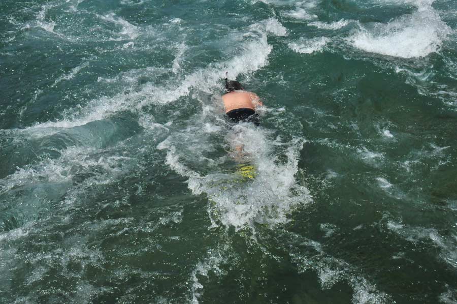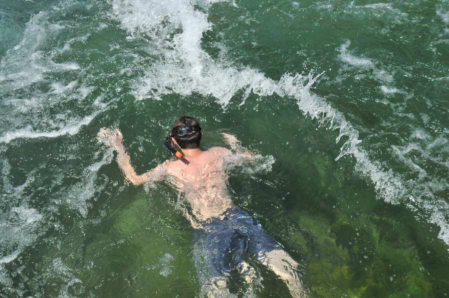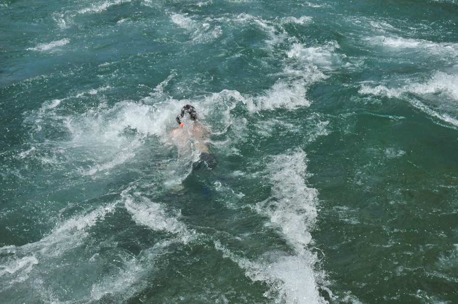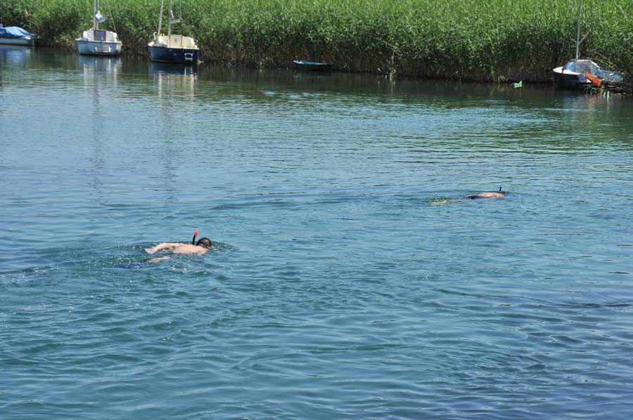 Wir überquerten die Brücke und sahen zwei Jungen im Wasser, die mit Taucherbrille und Schwimmflossen ausgerüstet, den Boden des Sees kurz vor dem Abfluss in den Fluss absuchten. Sprachschwierigkeiten verhinderten weitere Auskünfte, so das uns nicht klar wurde, was die Beiden am Seeboden suchten. Vielleicht aufgrund der vergeblichen Mühe der Suchenden, wandten sich beide jetzt des kräftigen Strömung des Seeabflusses zu und ließen sich von der Strömung unter der Brücke hindurch in den Fluss hinein ziehen. Sicherlich ein toller, wenn auch nicht ganz ungefährlicher Freizeitsport.