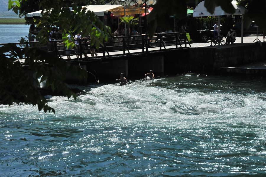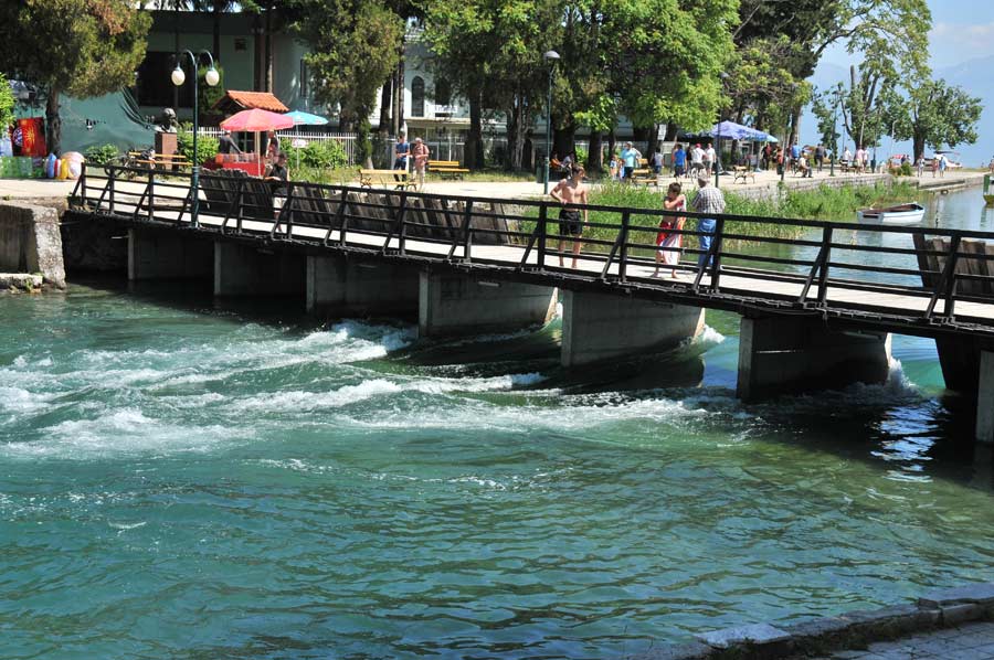 So führte unser erster Gang entlang des Flusses zum Ufer des Sees, der mitten im Ortskern von Struga den Ohridsee entwässert. Eine zweite Brücke, die auch gleichzeitig zur Regulierung des Wasserstandes im Ohridsee genutzt wird, lockte uns besonders an, da hier das Wasser mit kräftigen Strudeln aus dem Ohridsee heraus schoss. Die Staukonstruktion war dabei simpel und effektiv zugleich: kräftige, schräg gestellte Holzbohlen stauten das abfließende Wasser des Sees auf, wobei die Abflussmenge durch die Größe der Öffnung bestimmt wurde.