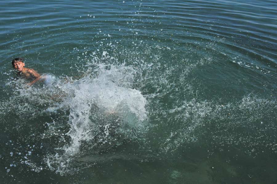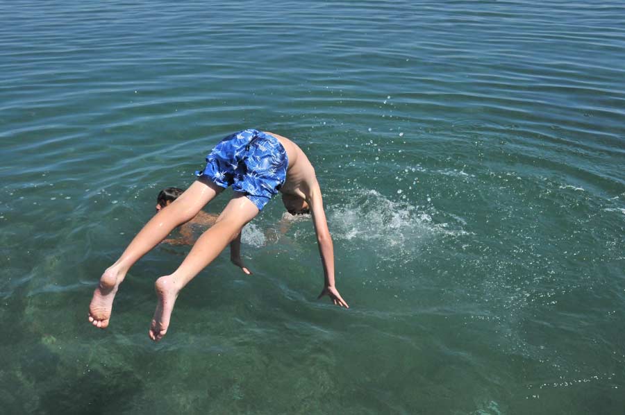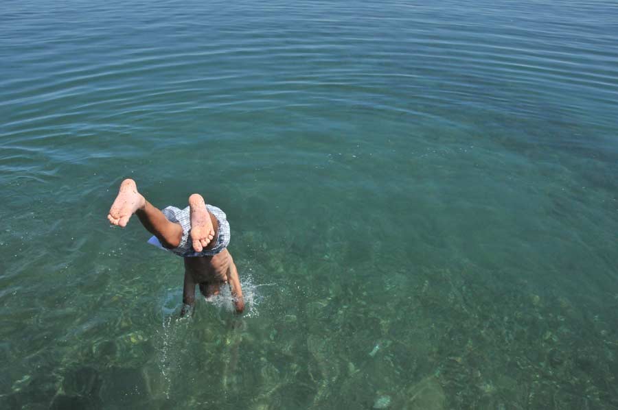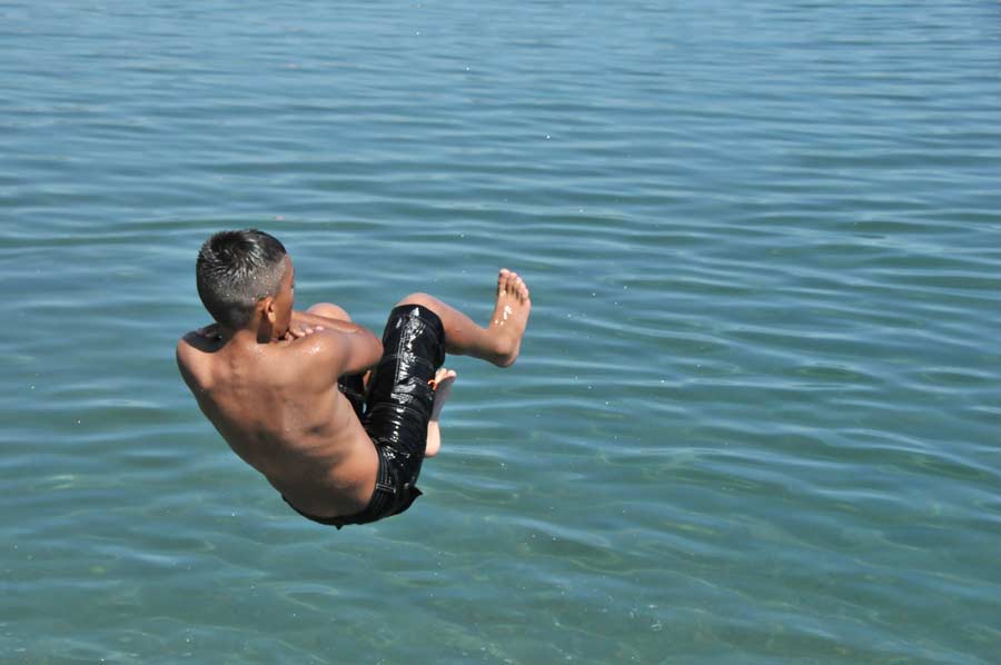 Nach einer Weile des Beobachtens verließen wir die Brücke und gingen am Ufer des Ohridsee entlang, das hier auch als Bootshafen und Badestrand gleichzeitig genutzt wird. Zur Befestigung des Ufers war dann eine Mole in den See hinein gebaut worden, die von einigen Jungen zum Abspringen in den See hinein genutzt wurde. Auch hier sichtlich Spaß am klaren, frischen Seewasser. Wie lang ist es her, das man inmitten einer Stadt in Westeuropa soviel Badespaß haben konnte.