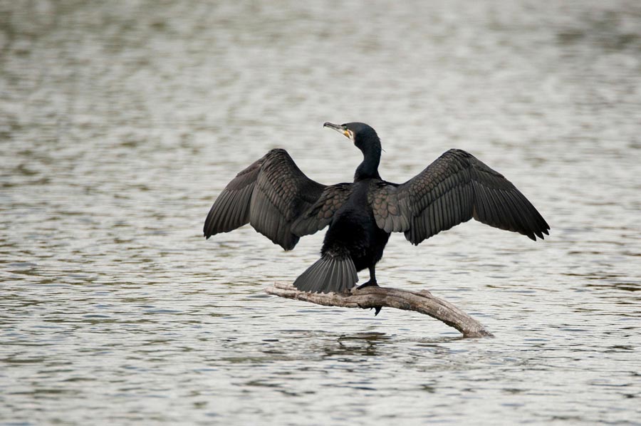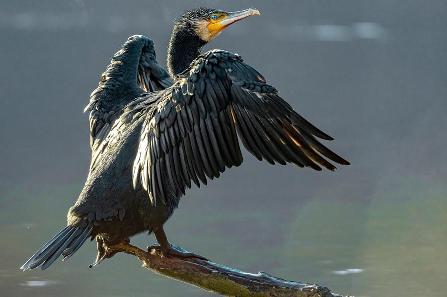 Kormoran erwacht im Morgenlicht am Ohridsee
