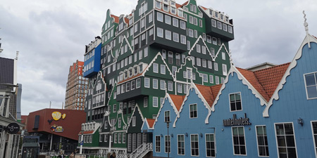 Wir waren mit den Rädern entlang der Zaan unterwegs, als uns in Zaandam ein auf den ersten Blick recht merkwürdiges Gebäude auffiel, dass in seiner Architektur aussah als wenn man klassische Zaanse-Schans Häuser übereinandergestapelt hätte, noch dazu in den typischen Grüntönen.