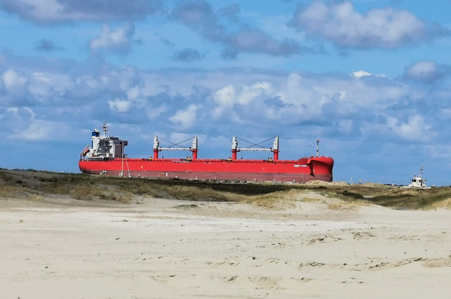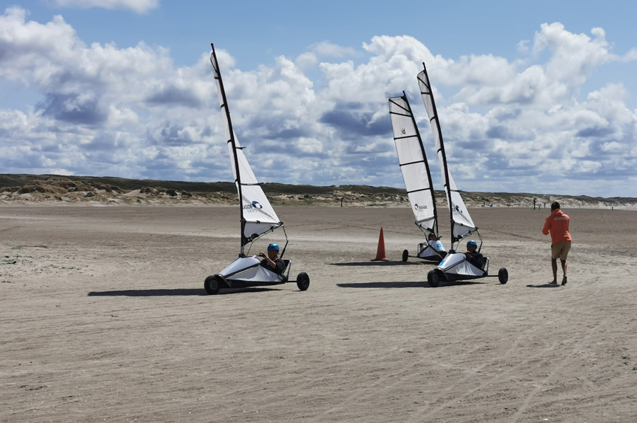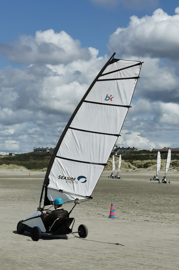 Bei einem unserer Spaziergänge am ewig weiten Strand vor den Dünen waren wir auf zahlreiche touristische Strandsegler und ihren Guide gestoßen und somit gleich in ein Gespräch verwickelt worden. Hier war ein großes Dreieck zu umfahren, das unter Anleitung des Guides als Schulung für das Handling des Strandseglers umgesetzt wurde.