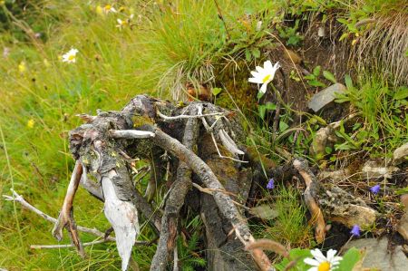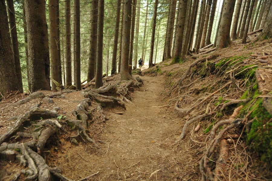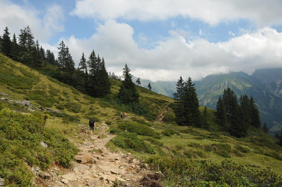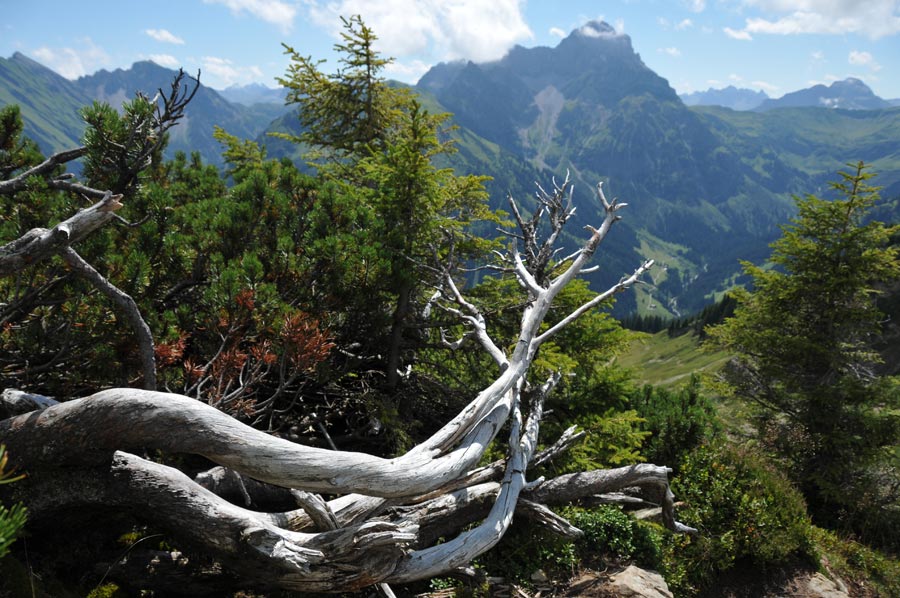 Wir erreichten den Abzweiger in Richtung Untere Lüchle Alpe, der nun zunächst durch Buschwerk und Streifen dichten Bergwaldes führte. Immer wieder beeindruckend sind die Bilder der Wurzelwerke der Bäume, die sich auf dem Pfad erstrecken. Überhaupt ist zu erkennen, das sich viel Totholz im Wald befindet, eine ökologisch gewollte Maßnahme zur Gesundung der Waldflächen im natürlichen Sinne. Überhaupt wird die Ökologie hier im Kleinwalsertal recht konsequent voran gebracht, was sich auch in der Versorgung der Bewohner und Gäste deutlich wieder spiegelt. So werden heimische Produkte ohne aufwendige Transportwege nicht nur von ökologisch motivierten Konsumenten bevorzugt. Überhaupt zeigt sich das Kleinwalsertal recht offen für alle Anwendungsbereiche von Möglichkeiten der Erholung von Körper und Geist.