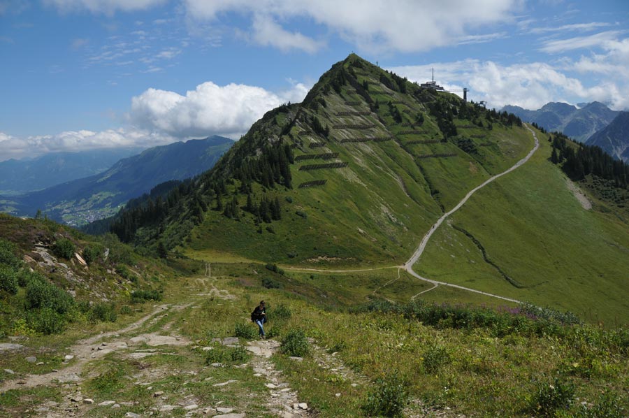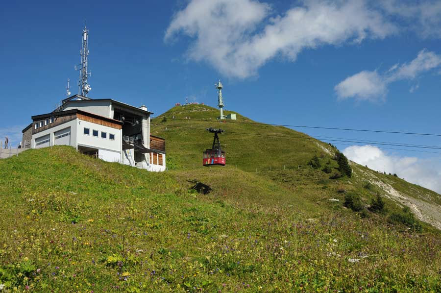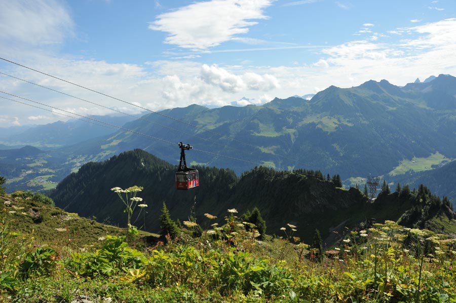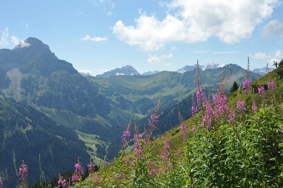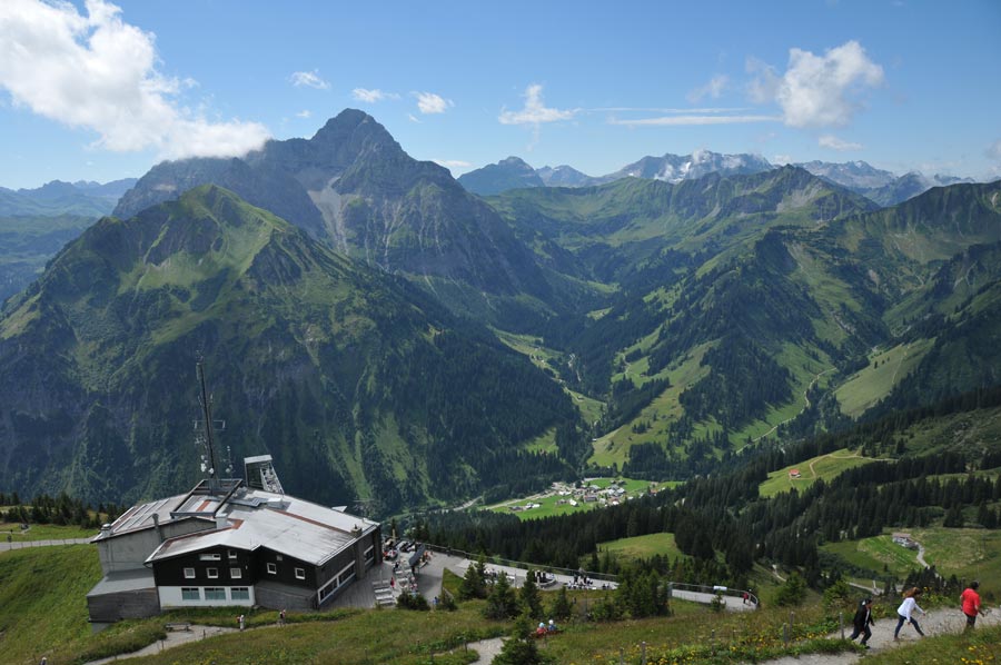 Unser Augenmerk richtet sich vor allem auf das zuletzt genannte Walmendingerhorn und dessen Kabinenseilbahn, die uns zum ersten Gipfel im Kleinwalsertal bringen soll um zunächst einen Überblick über das Tal zu erhalten. Bereits die Talstation der im Jahr 1966 erbauten Walmendingerhornbahn liegt auf 1.200 Metern Höhe. Im Jahr 2006 komplett renoviert und mit einer großen Aussichtsplattform und einer Sonnenterasse ausgestattet, ist das Walmendingerhorn heute für Bergtouristen der Ausgangspunkt vieler Rundwanderungen. Auch sehr interessant ist der Alpenblumenlehrpfad, der zwischen der Bergstation auf 1.946 Metern und dem Gipfelkreuz entlang führt. Schon am kommenden Vormittag, so unser Plan, wollten wir zunächst der angekündigten Führung entlang des Alpenblumenlehrpfads teilnehmen um danach eine erste Wanderung anzugehen, so denn das Wetter mitspielt.