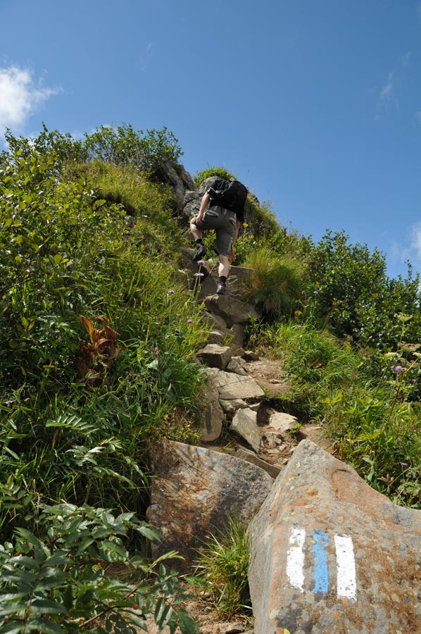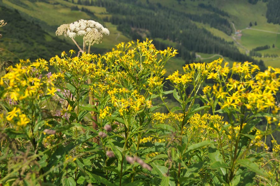 Und siehe da, das Wetter zeigte sich von seiner besten Seite. Keine Wolke am Himmel weit und breit und so hieß es am frühen Morgen, das kleine Rucksackgepäck mit notwendigen Stärkungen geschultert und auf zur Talstation. An der Bergstation erwartete uns bereits der Blumen- und Kräuterkundler, der einen so interessanten Rundgang gestaltete, das wir spontan entschieden, einem Teil der neuen Erkenntnisse in einem getrennten Artikel zu beschreiben. Allein der kurze Weg bis zum Gipfelkreuz wies 130 Blumenarten auf, die teilweise noch in voller Blüte standen.
