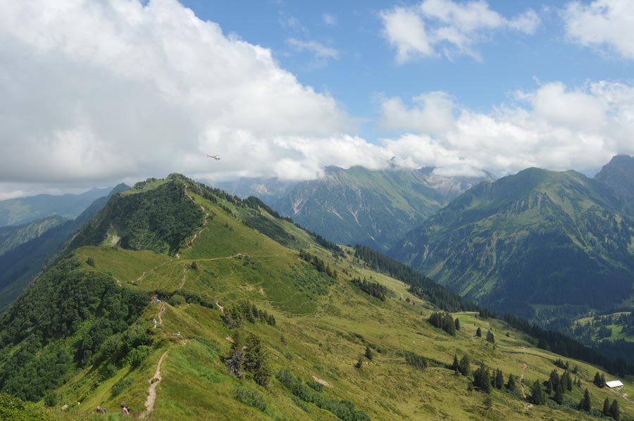Vom Walmendingerhorn ging es zunächst auf der recht bequemen, wenn auch teilweise relativ steilen Route 2 hinab bis kurz vor die Abzweigung zur Oberen Lüchle Alpe, die aufgrund der traditionellen Käseherstellung recht bekannt ist. Die Gabelung hinauf zu den Ochsenhofer Köpfen (Route 9) ist gut ausgeschildert, wenn auch relativ steil bergauf. Der hochalpine Gratweg führt über aussichtsreiche Pfade bis zur Ochsenhofer Scharte. Schon der erste Gipfel lohnt die Mühe allemal, da sich das Panoramabild während des Wanderns laufend verändert. Vorsicht an den ersten Gratkanten, zu leicht kommt man ins Rutschen. Hier waren auch Touristen mit Kindern unterwegs, denen man lieber abgeraten hätte. So musste der "Vater" tragender Weise für die erste Gratpassage sorgen, was sehr halsbrecherisch aussah. Leichtsinn, der schnell zu Unfällen führen kann. Nicht umsonst fordert der Touritikführer hier: "Trittsicherheit, Schwindelfreiheit und festes Schuhwerk erforderlich". Hier am ersten Gipfel trafen wir auf zwei Wanderinnen, die, ihre Rast gerade beendet, heute noch bis zum Grünhorn gelangen wollten, einem Gipfel im Anschluss an die Ochsenhofer Scharte, von 2039 Metern Höhe.