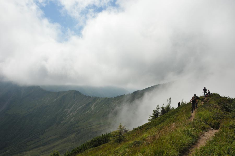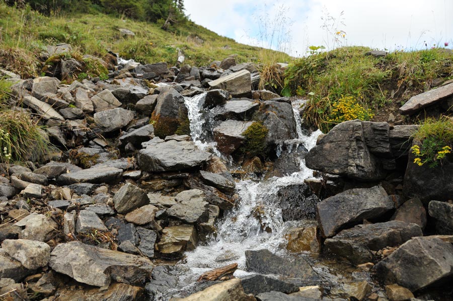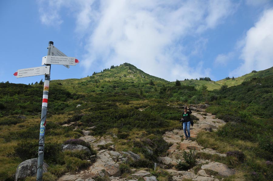 Kurz vor dem letzten Gipfel der Ochsenhofer Köpfe zogen erste Wolken auf, die sofort die Temperatur merklich minderten. Jetzt war vorsorglich Regenzeug angesagt und auch die Route hinab in die Ochsenfurter Scharte wurde etwas rutschiger, aber Dank guten Schuhwerks noch gut zu meistern. Etwas tiefer angelangt, lösten sich die Wolken im Tal allerdings auch schnell wieder auf, so das wir unsere weiteren Fotos bei Sonnenschein machen konnten. Die Route 5, die wir jetzt beschritten, führte über Hochalmen und kleine Bachläufe hinab zum Inneren Stierhof, der auf 1.680 Metern eine willkommene Raststation ist. Nur wenig später trafen wir auf einen Mountainbike-Fahrer, der nach dem Weg zu eben dieser Hütte fragte. Grundsätzlich fanden wir überall entsprechende Wegmarkierungen vor, so das ein Fehlleiten geradezu ausgeschlossen erschien. Aus der Sicht des Mountainbikers stellt sich die Problematik wohl etwas anders dar.
