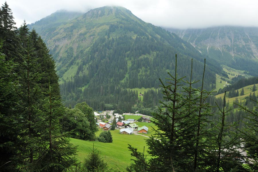 Einmal auf dem Campingplatz Vorderboden im Kleinwalsertal eingerichtet, hatten wir uns zu einem ersten Erkundungsrundgang in den Ort Mittelberg aufgemacht, neben Baad und Rieslern Hauptorte der funktionellen Exklave Kleinwalsertal. Es gibt nur eine Straße in das österreichische Tal hinein, die nur von Deutschland aus genutzt werden kann.