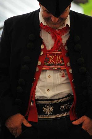 Mann trägt dazu den Dreispitz, einen Hut besonderer Machart