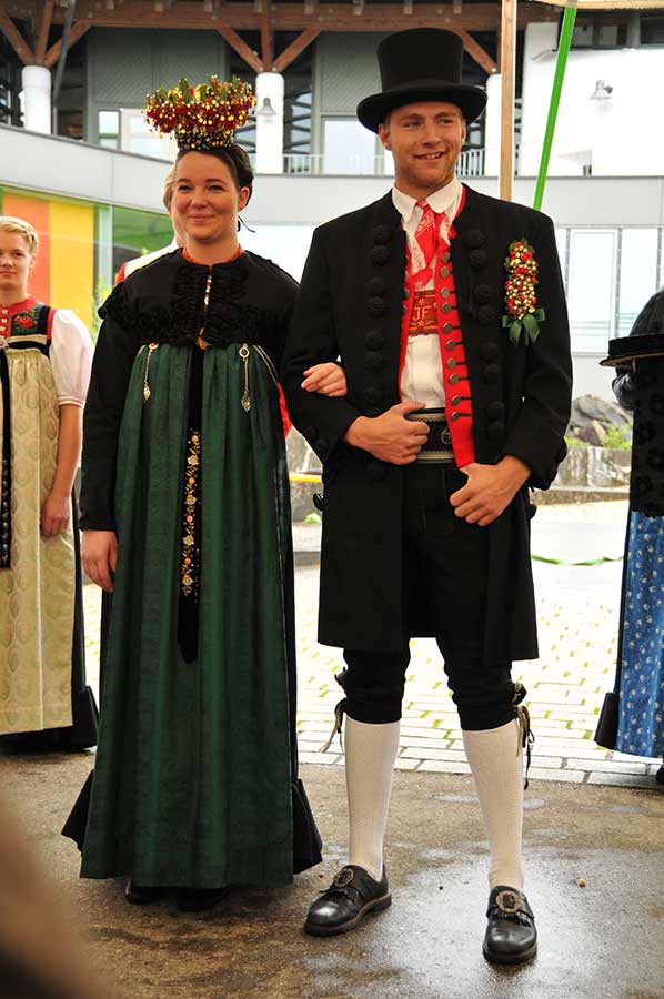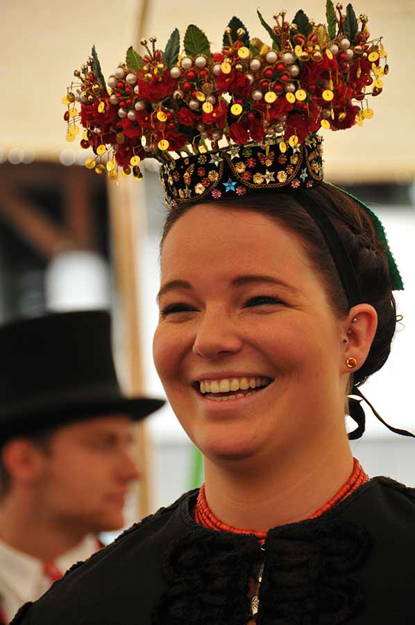 Zu festlichen Anlässen wird der Chranz, die Krone, getragen. Die “Ärmel” (kurzes Jäckchen) oder das “Schälkle” (Jacke mit Chenille verziert) und der “Blaetteleschgürtl” sind zu dieser Kopfbedeckung Pflicht.