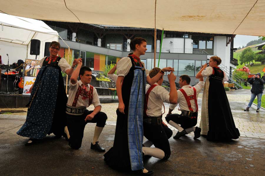 Mit einem leckeren Stück Walserkuchen und Kaffee gerüstet, nahmen wir unter den Besuchern Platz, die auf Bierzeltgarnituren unter dem Baldachin versammelt waren. Leider gab es zwischenzeitig immer wieder Regenschauer, was die Stimmung ein wenig trübte.