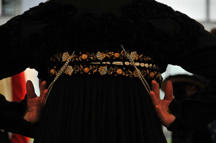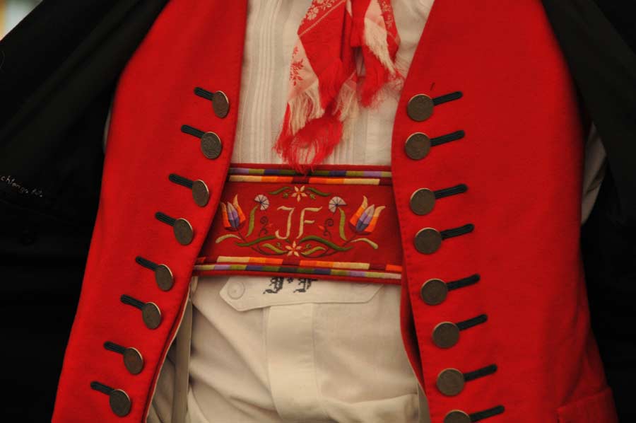 Einige Gesichter der Vorführenden waren uns bereits in der Tanzgruppe aufgefallen, die jetzt unter der Moderation ihrer Sprecherin die Trachten vorführten. So wurde uns auch erläutert, das bereits an der Tracht erkennbar war, ob es sich um verheiratete oder unverheiratete Personen handeln würde. Eine recht praktische Einrichtung, die vielleicht auch heute als ein Modell für die moderne Zeit in dunklen Diskos angesagt wäre. Aber jetzt zunächst zu den Männern.