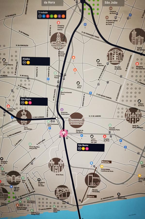 Einmal am Flughafen Porto angekommen, ging es mit öffentlichen Verkehrsmitteln, hier der U-Bahn Linie E, nach Porto hinein. Etwa eine halbstündige Fahrt stand an, die uns nach Trindade im Zentrum von Porto gebracht hatte, nicht weit entfernt von unserer Unterkunft. An dieser Stelle sei angemerkt, dass man auch zur Rückfahrt mit dieser Linie E fahren sollte, um die unendlich zahlreich erscheinenden Haltepunkte der Linie B zu ersparen.