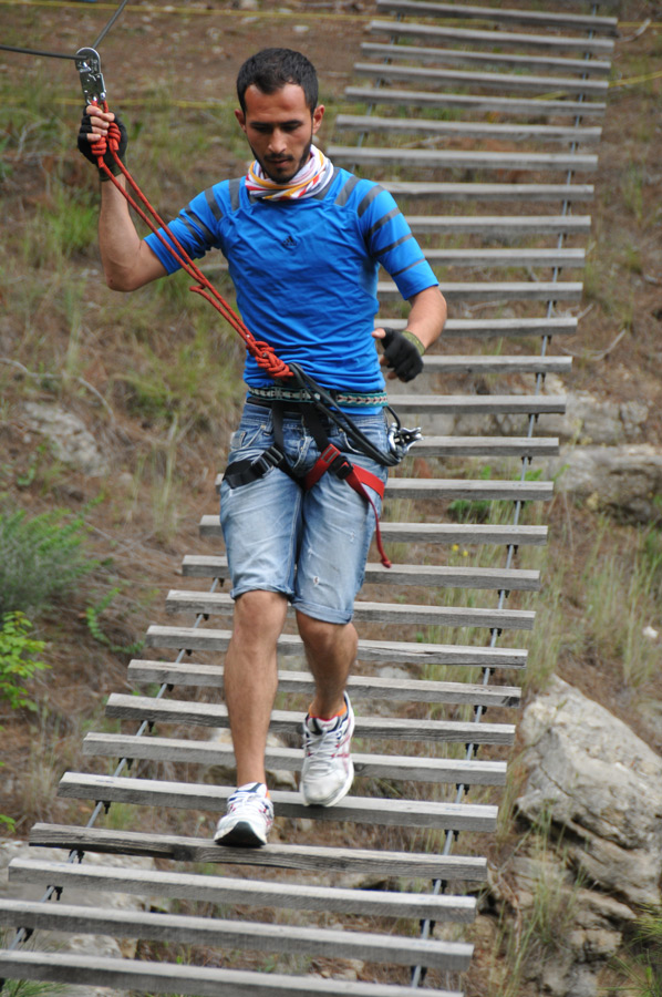 Der Gruppenleiter hatte schon im Vorfeld die Reihenfolge der Teilnehmer festgelegt, dabei die schnellsten nach vorn geschickt, um so den Druck von den langsameren Kletterern durch nachfolgende Teilnehmer zu vermindern. Schnell stellte sich heraus, das dies eine wirklich gute Maßnahme war. Da Serken Kaplan in erster Linie Lehrer am Bahcesehir College ist, sind ihm die teilnehmenden Pfadfinder in der Regel gut bekannt. Unverkennbar war allerdings bei allen der Spaß zu bemerken, im Freien aktiv zu sein. Auch die langsameren Teilnehmer hatten ihr Vergnügen, auch wenn Steigen auf dem schwankendem Untergrund recht anstrengend ist. Nach gut einer Stunde war der erste Durchgang absolviert und es ging zurück zur Terrasse des Kletterparks, wo schon ein zünftiges Hähnchengulasch auf die Gruppe wartete. Am kommenden Vormittag sollte ein weiterer Parcoursdurchlauf erfolgen.