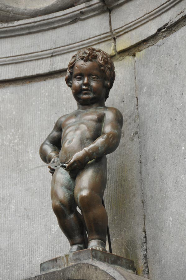 Wir streben in die ersten Seitengassen und gelangen schnell zur wohl bekanntesten „Persönlichkeit“ Brüssels, dem Männeken Pis. Recht unscheinbar an einer Gebäudeecke durch einen massiven Eisenzaun vor allzu eifrigen Fans geschützt, ist diese doch nur 60 Zentimeter große Bronzefigur zur Touristenattraktion geworden. So finden sich hier auch heute trotz des nicht gerade einladenden Wetters ständig wechselnde Besuchergruppen ein. Wir verlassen den ständig pieselnden und dabei fröhlich grinsenden Jüngling und besuchen jetzt ein kleines Schokoladenmuseum nur etwa 100 Meter vom Grand Place entfernt in der Rue Tete dÓr.