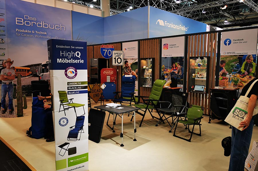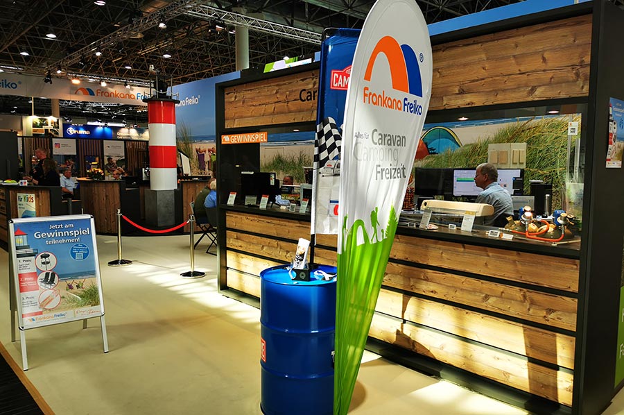 Jedes Jahr präsentieren wir uns gemeinsam mit FRANKANA auf dem Caravansalon in Düsseldorf und auf der CMT in Stuttgart. Wir beliefern ausschließlich den Fachhandel mit Zubehör. Trotzdem haben wir, als führende Zubehörgroßhändler, immer ein offenes Ohr für den Endverbraucher. Schließlich ist der Konsument (also der Camper, Caravaner oder Reisemobilist) "das wichtigste Glied in der Absatzkette" – er entscheidet mit seinen Ansprüchen und Vorstellungen über Erfolg oder Misserfolg eines Produktes. Deshalb werden die Kunden auf dem Messestand in Düsseldorf von fachkundigem Personal beraten. Gleichzeitig werden interessierten Kunden die FRANKANA FREIKO-Fachgeschäfte in seiner Region mitgeteilt.