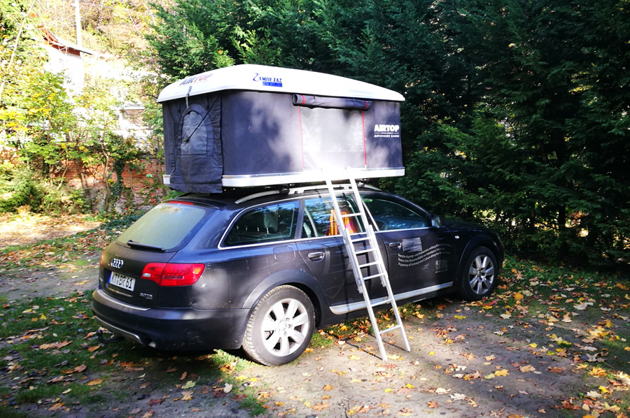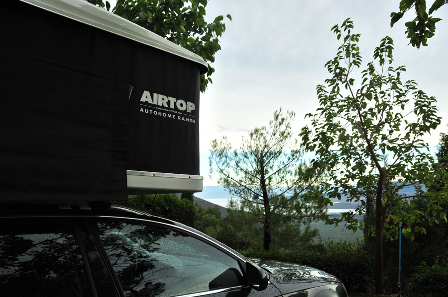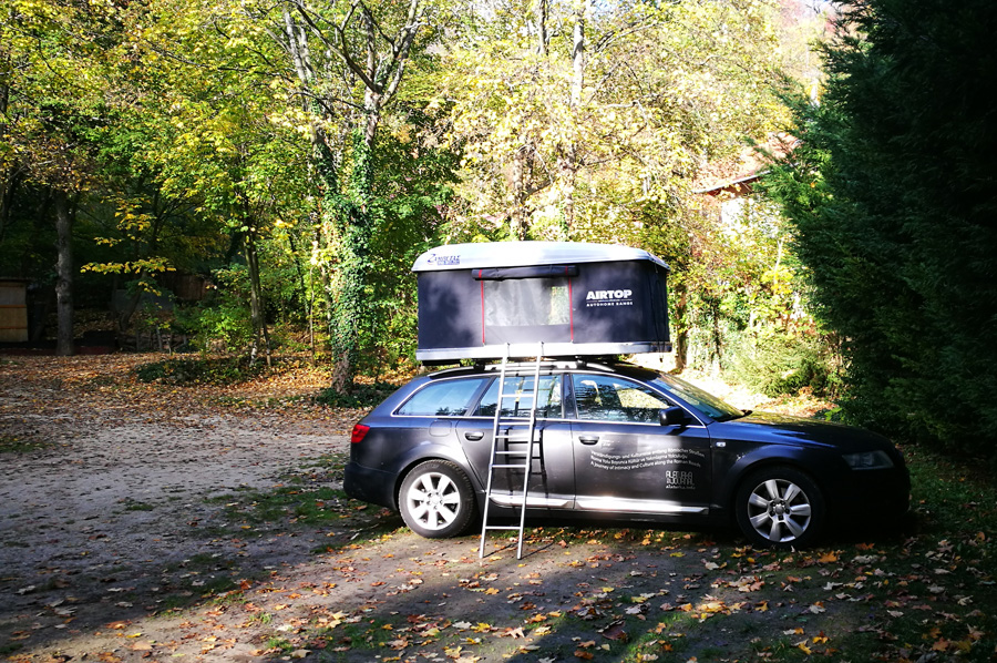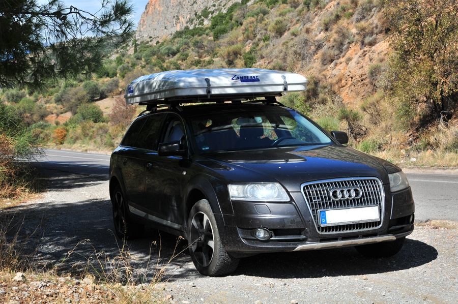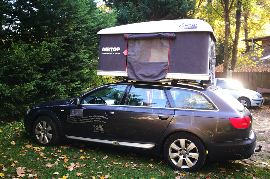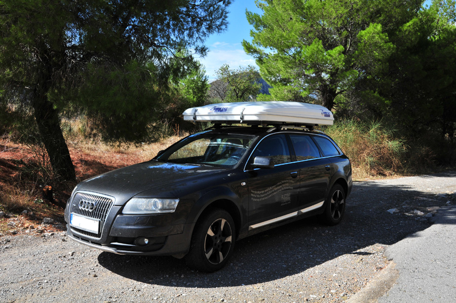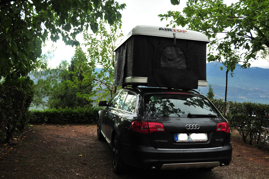 Unser lieber Freund und häufiger Gastgeber Toni Zampetas in Thessaloniki verfügte über ein solches Dachzelt eines namhaften Herstellers, das wir zu Erkundungszwecken für eine Tour nach Delphi einsetzen wollten. So montierten wir die vorhandenen Querträger auf unserem Audi, schoben dann die geschlossene Dachbox auf das Fahrzeug auf und befestigten es mit den dazugehörigen Metallschlaufen, die die Dachträger umfassen und so eine schnelle und sehr feste Verbindung gewährleisten. Natürlich sollte man auf die optimale Ausrichtung der Zeltbox auf dem Fahrzeugdach achten, wir hatten keinerlei Einschränkungen während der Fahrt. Das wars aber auch schon mit den technischen Vorkehrungen, eine Schiebeleiter ist im Ausstattungsumfang der Zeltbox mit vorhanden.