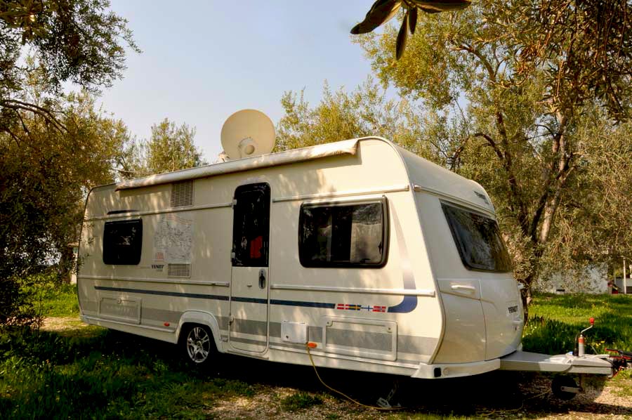 Auch uns hatte es im Rahmen der Projektarbeit in der Grenzregion zu Griechenland getroffen, wo wir einem entgegenkommenden Fahrzeug etwas ausweichen mussten und dabei mit dem Wohnwagenanhänger von der festen Straßendecke abkamen. Zunächst ein Anhalten und besichtigen des Fahrzeugs, ob denn irgendetwas passiert sei, so wurde ein Schaden erst am Abend auf dem nächsten Stellplatz klar: ein angeschlagener Stoßdämpfer, aus dem das Öl ausgelaufen war, womit seine Wirkung natürlich auch verloren gegangen war. Auch wir sind hinsichtlich der Fahrzeugtechnik keine Vollprofis, so waren wir dann froh, noch am späten Abend mit Toni Zampetas vom Camping-Zubehörhandel und Stellplatz in Thessaloniki die Aussage zu erhalten, das wir bei vorsichtiger Fahrweise bis zu ihm nach Thessaloniki kommen könnten. Nach Klärung der Fahrzeugdaten unseres Projektfahrzeugs Fendt Saphir Scand beschlossen wir, am kommenden Tag nach Thessaloniki zu kommen.