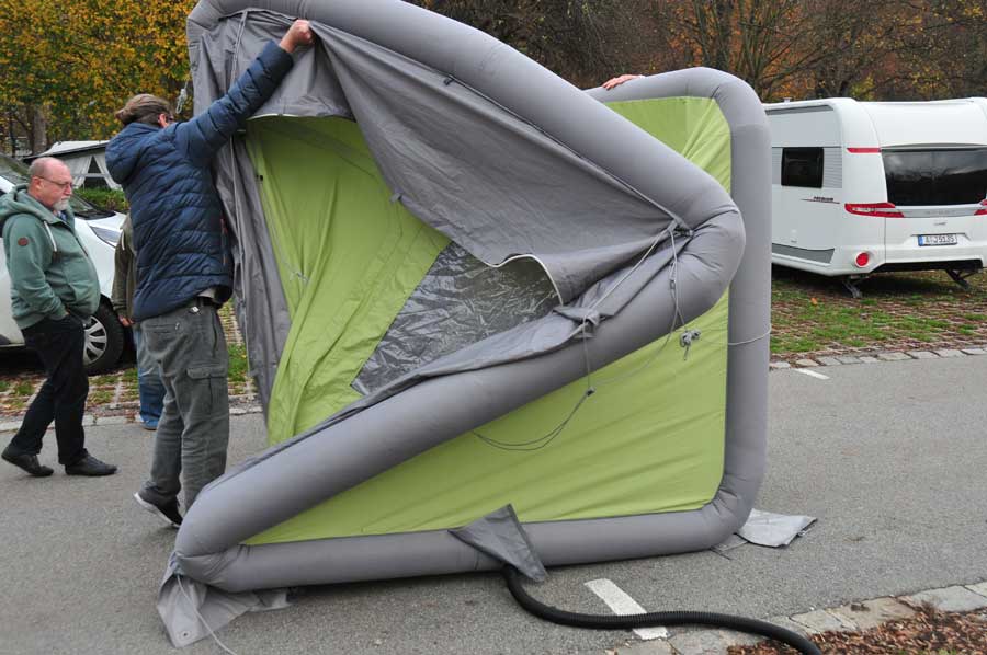 Die Firmenbeschreibung zum GT Box besagt: ein flexibles, aufblasbares Vorzelt für PKWs, Busse & Reisemobile, womit die GT BOX das Multitalent innerhalb der GentleTent Produktfamilie ist. Der große Vorteil dieses kompakten Vorzelts liegt in seiner enormen Flexibilität. Wir waren gespannt und wollten Aufbau und Erläuterungen gern vor Ort mit verfolgen.