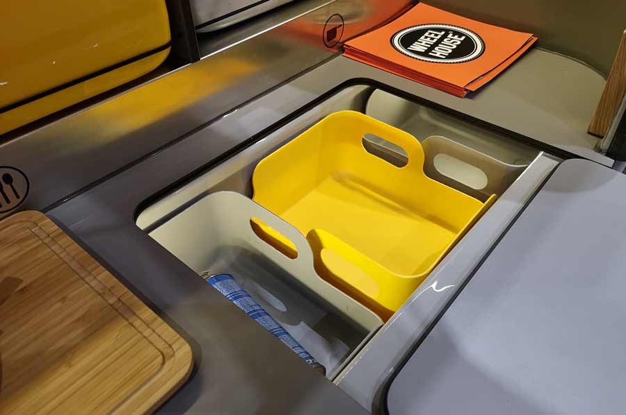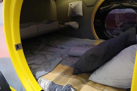 Wenn allerdings das gelungene Design schon lockt, wobei allein der Einstieg mit den Bull-Augen-Fenster schon genügt, ist das Interesse geweckt. Eine gemütliche Schlafkoje, die aufgrund der transparenten Abdeckung den Blick in den Sternenhimmel erlaubt, ist für klaustrophob veranlagte Personen allerdings gewöhnungsbedürftig. Allein, die Heckküche ist ein Traum. Sauber verarbeitete Materialien, ordentlich aufgeräumt und passgenau, gelungene Farbwahl. Sofort erkennbar, dass hier Designer am Werke waren. Uns hat das Fahrzeug sehr gut gefallen.