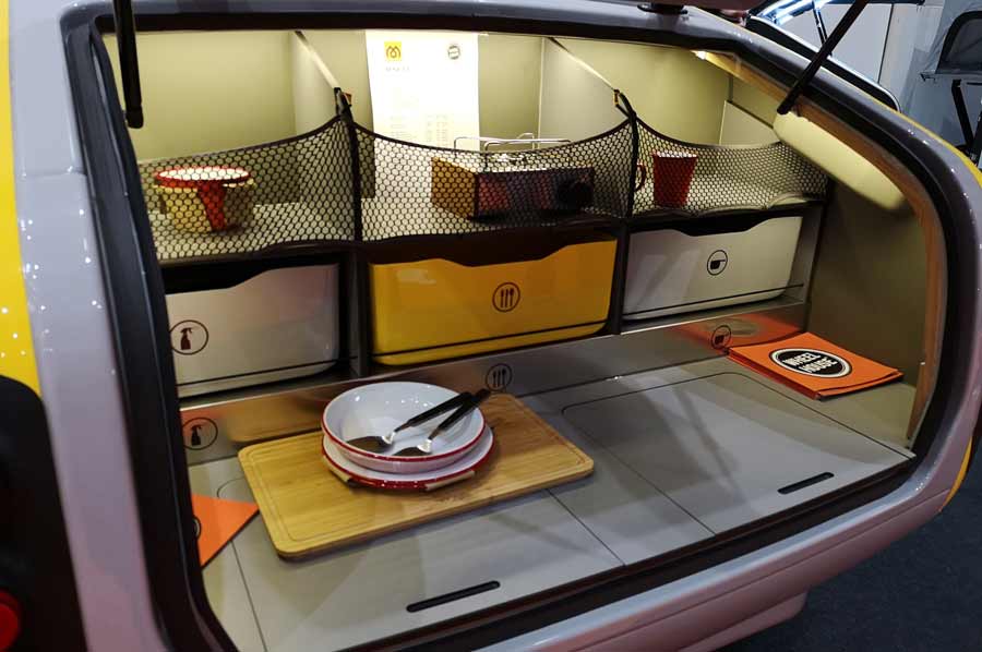 Das Camper-Leben mit einem Tropfen-Wohnwagen findet größtenteils draußen statt. Im Heck lässt sich eine große Klappe öffnen, darunter ist die Außenküche eingebaut. Sie enthält meist einen 12-Volt-Kühlschrank, einen Kocher mit zwei Gasflammen, Schubladen für Geschirr und Lebensmittel und ein Spülbecken mit einem Wasserkreislaufsystem, der manuell bedient werden muss. Soweit bekannt von vielen Modellen.