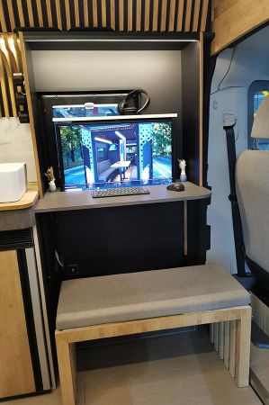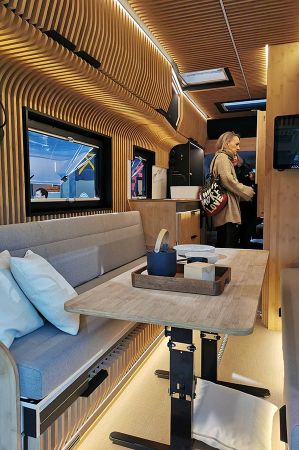 Der Alpine Cross Cabin Signature wurde entwickelt, um eine mobile Arbeitsumgebung für unterwegs zu Sschaffen. Der Konferenz- und Essbereich im Heck ist mit einem 1,30m langen Tisch ausgestattet, der über USB-, HDMI- und Stromanschlüsse verfügt. Außerdem kann ein großer Touchscreen-Monitor zum Präsentieren von Dateien oder als digitales Whiteboard verwendet werden. Der separate PC-Arbeitsplatz neben der Eingangstür verfügt über einen ausfahrbaren 27-Zoll-LCD-Monitor, an den ein externer Laptop angeschlossen werden kann. Der Alpine Cross Cabin Signature bietet einen High-Speed-5G-Mobilrouter mit externer Antenne, was Videoanrufe, Streaming und Cloud-basierte Arbeit in perfekter Qualität ermöglicht. Die Fahrzeugkabine ist gegenüber der Außenumgebung schallisoliert, um unterbrechungsfreie Videokonferenzen an lauten Orten oder bei starkem Regen zu gewährleisten.