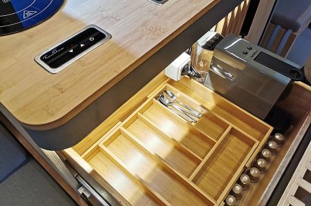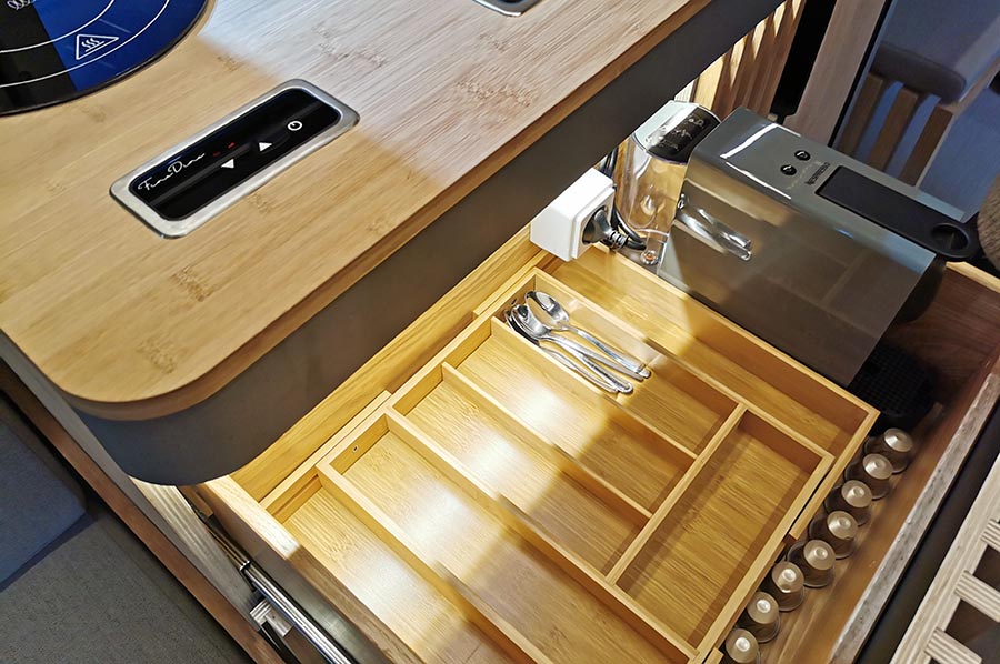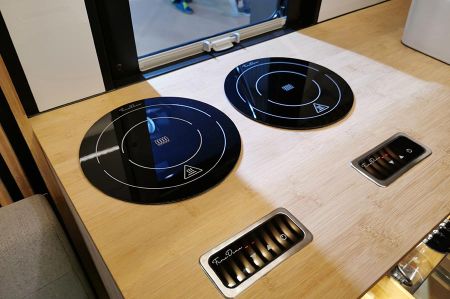 Der Küchenbereich des Alpine Cross Cabin Signature umfasst zwei 800-Watt-Induktionskochfelder, ein Spülbecken sowie einen in die Kücheneinheit integrierten 70-Liter-Kühlschrank von Dometic. Es gibt mehrere Schubladen und Gepäckfächer für Küchengeräte, Besteck und andere Haushaltsgegenstände.